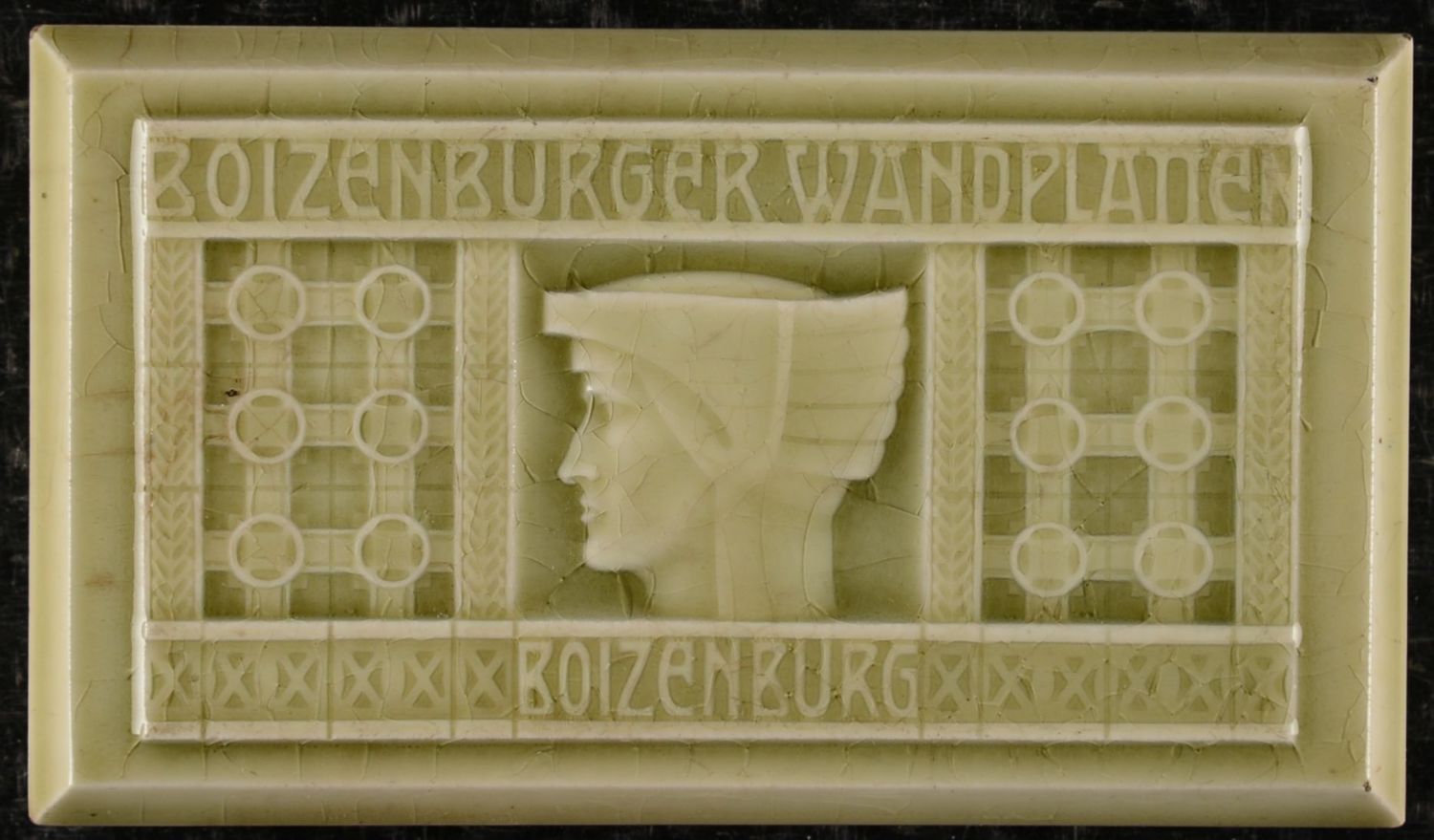 This rare advertising presse-papier from Boizenburg Wandplatten is a finely modelled example of early 20th-century ceramic promotional art. Executed in dust-pressed relief, the piece displays crisp detailing and a soft, translucent glaze that enhances its sculptural presence. At the centre appears a classical profile of a woman, her stylised features rendered with elegant restraint. She is framed by two geometric panel motifs, each composed of interlocking circles and latticework that echo the decorative vocabulary of the period. Surrounding these elements, the raised inscriptions “BOIZENBURGER WANDPLATTEN” above and “BOIZENBURG” below underscore the object’s function as an advertisement as well as a decorative display piece.