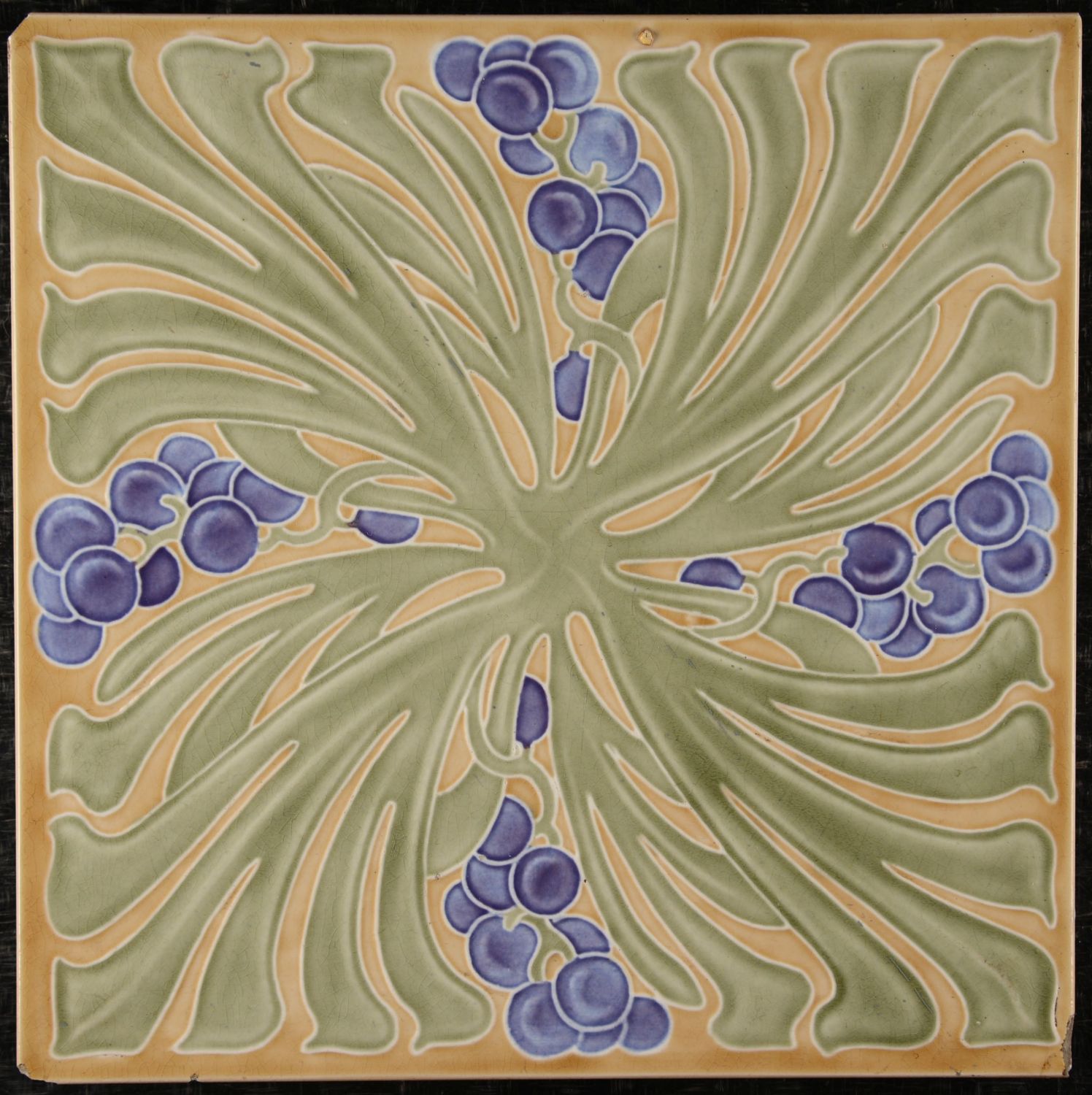 Villeroy & Boch Dresden Art Nouveau Tile, c.1900 A striking large-format Art Nouveau tile made around 1900 by Villeroy & Boch, Dresden. The design features a dynamic organic pattern of flowing pale green-grey leaves and clusters of purple berries set against a warm ochre background. Executed in relief using the traditional dust-press technique, the tile displays the fine craftsmanship and fluid elegance typical of the Art Nouveau period. The glossy glaze enhances the natural tones and sculptural detail.Condition: Very good overall, with some minor corner damage not affecting the visual appeal.An authentic and decorative piece of early 20th-century German ceramic artistry — ideal for collectors or period interiors.