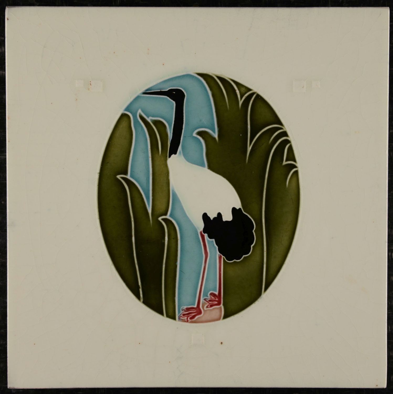 This striking Art Nouveau tile was produced by Boizenburger Wandplattenfabrik, Boizenburg an der Elbe, a factory founded in 1903 and still active today—its long ceramic tradition now celebrated in the town’s dedicated tile museum. The design features a beautifully stylised crane standing among tall reeds, framed within an oval reserve. The softly blended glazes in blue, olive green, and white create a serene, almost atmospheric composition that is characteristic of early 20th-century Boizenburg production. The relief is crisp, allowing the colours to pool gently within the contours and enhancing the elegant lines of the bird and foliage. The surface shows clearly visible craquelure, with light impurities caught within the cracks, adding a subtle sense of age and authenticity.