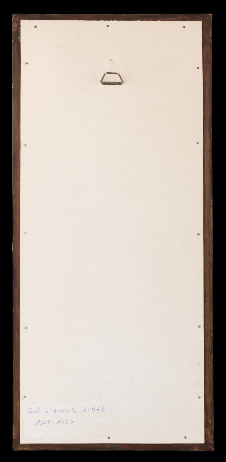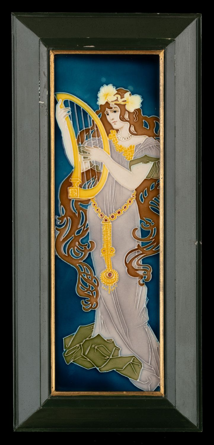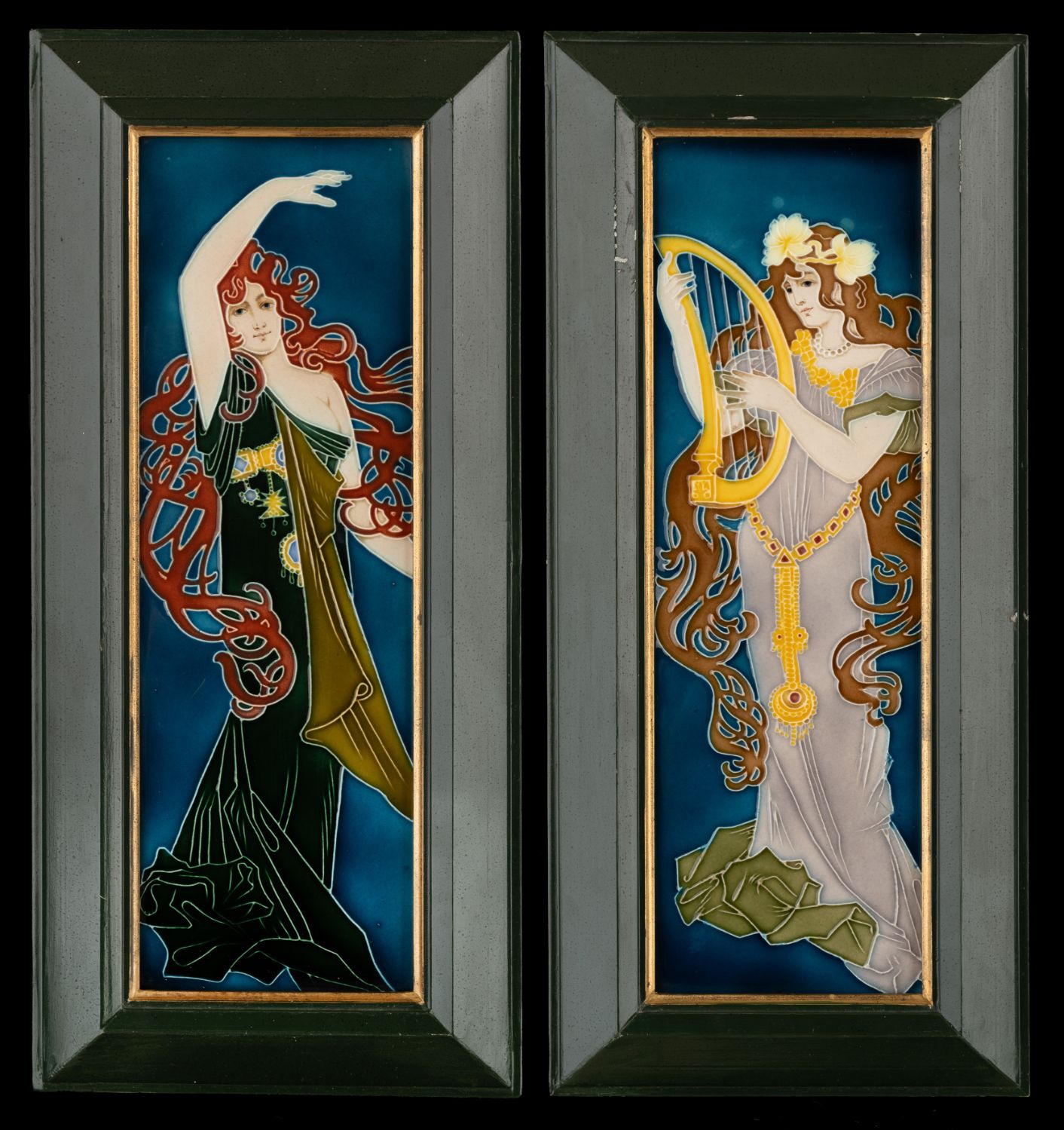 Beautiful pair of Art Nouveau ceramic tiles depicting elegant, elongated female figures in the characteristic flowing style of the Jugendstil movement. One figure is shown playing a harp, while the other poses gracefully with raised arm, both surrounded by stylized, flowing hair and decorative organic forms. The design is by Carl Sigmund Luber, artistic director of the artistic faience department at Johann von Schwarz in Nuremberg. He worked for this company from 1896 until the closure of the artistic department in 1906. The rich cobalt-blue background enhances the finely detailed relief decoration, with subtle shading and vibrant colors including deep greens, warm browns, soft lilac, and golden yellow accents.Both tiles are mounted in a dark green wooden frame with gilt inner borders, ready for display. Very good condition with light, age-related wear consistent with early 20th-century production. The frames show minor signs of use.