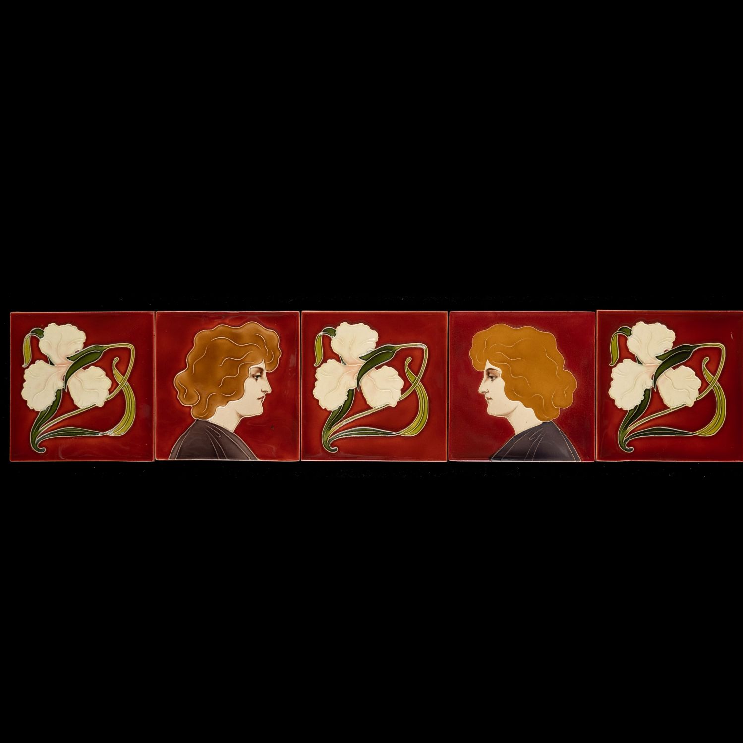 set of 5 art nouveau tiles depicting woman and flowers. The design is by Carl Sigmund Luber, artistic director of the artistic faience department at Johann von Schwarz in Nuremberg. He worked for this company from 1896 until the closure of the artistic department in 1906. These tiles are also pictured in Carl sigmund Luber, his life and work as an artist for the Art Nouveau ceramics of Johann von Schwarz, 1896-1906, published 2006, page 120. The tiles were once part of a piece of furniture. Condition is very fine, with only a few very light scratches to fragile dark red background glaze.