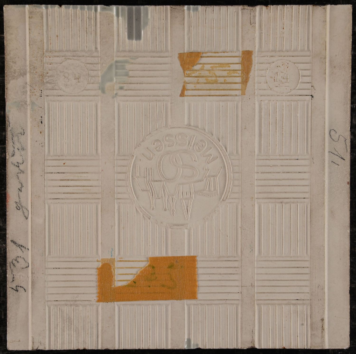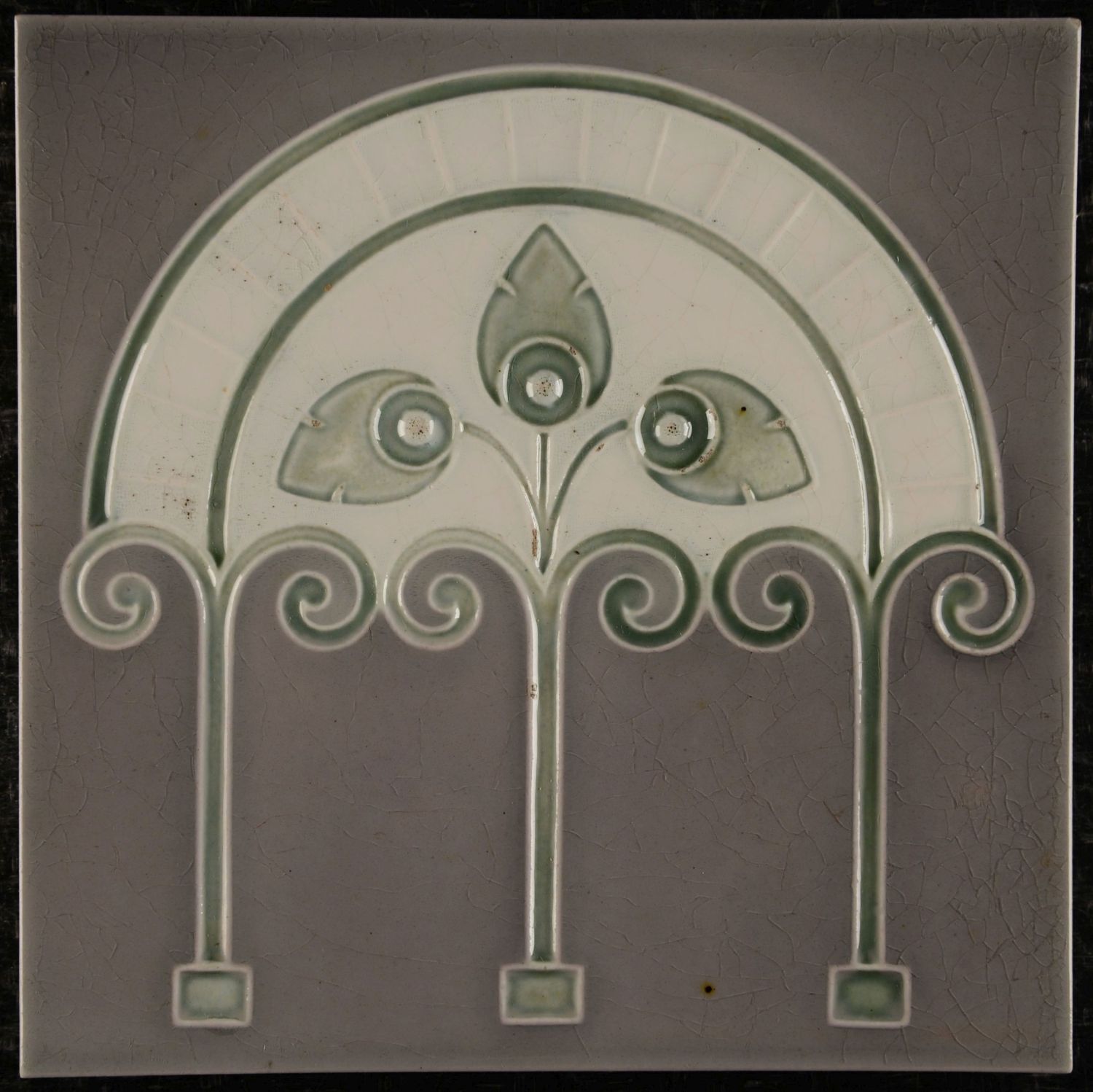 A beautiful original Art Nouveau tile by S.O.F. (Sächsische Ofen- und Schamottewarenfabrik), Meissen, Germany, dating to the early 1900s. The design features a highly stylised architectural motif with three slender stems rising into elegant scrolls and floral forms, all framed by a softly arched fan-like element. The subtle palette of smoky grey, pale green and white gives the tile a refined, almost graphic look, typical of Jugendstil design. The decoration is executed in relief with softly shaded glazes, creating depth and a gentle tonal transition across the raised lines. The tile shows an attractive, even surface with typical age-related crazing, and the factory mark is clearly visible on the reverse.