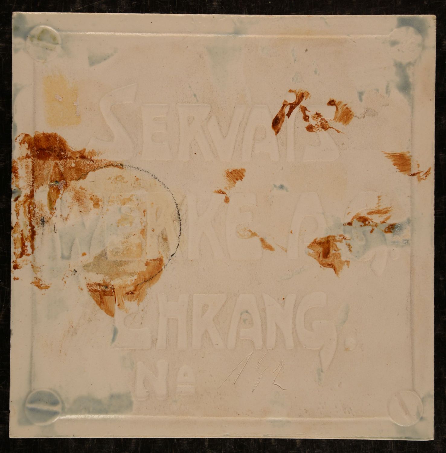 Elegant Art Nouveau ceramic tile produced by Servais Werke, Ehrang, Germany, around 1905. The tile features a stylized floral motif, framed by flowing, symmetrical lines that create a harmonious and almost architectural composition. Executed in relief with a soft, monochrome grey glaze, the tile has a refined and understated appearance. Good antique condition with light craquelure consistent with age.