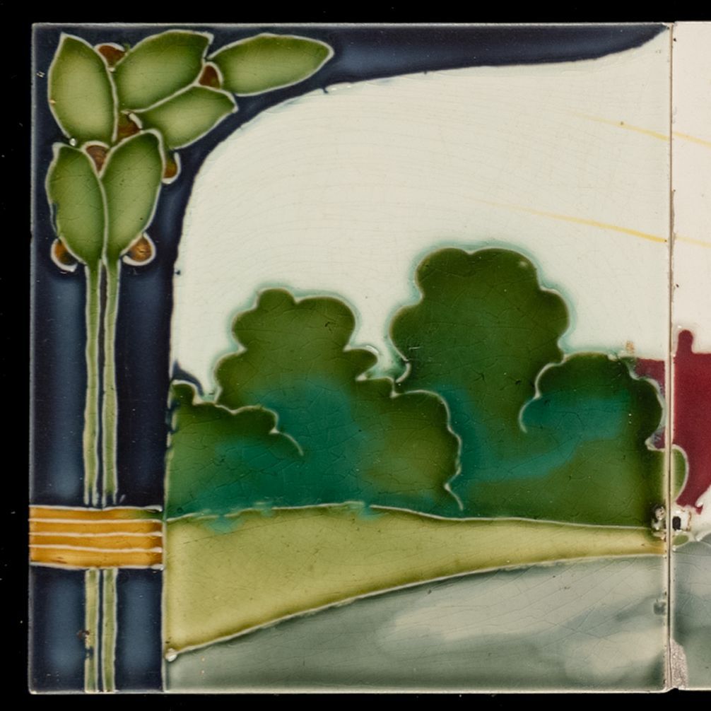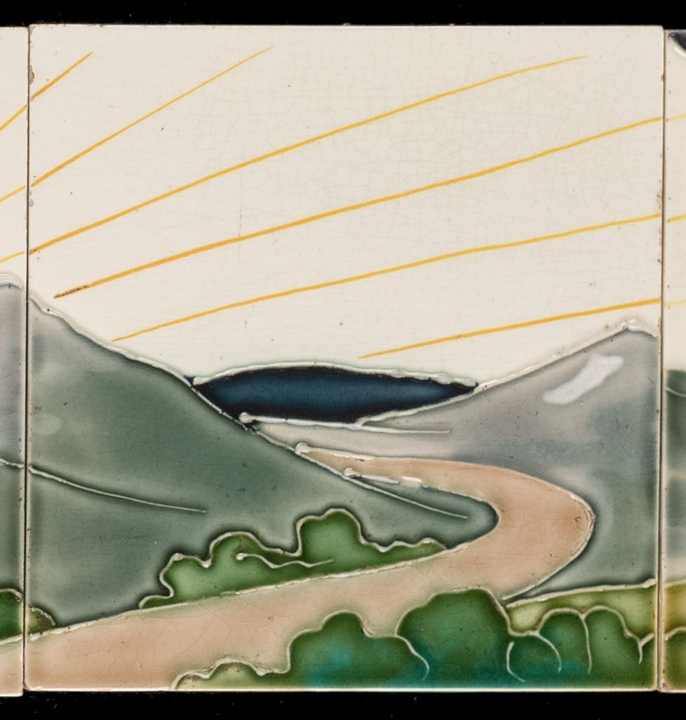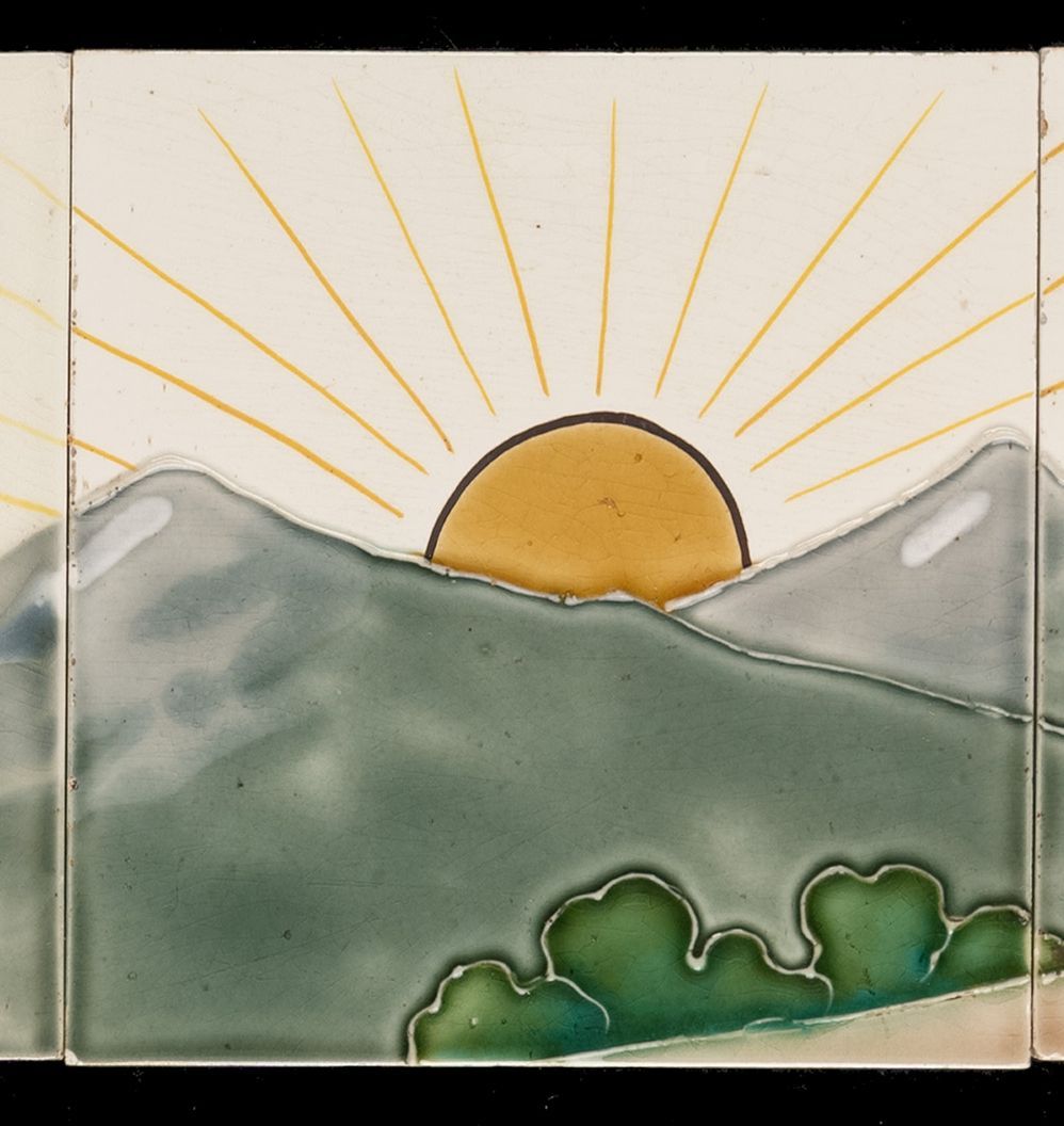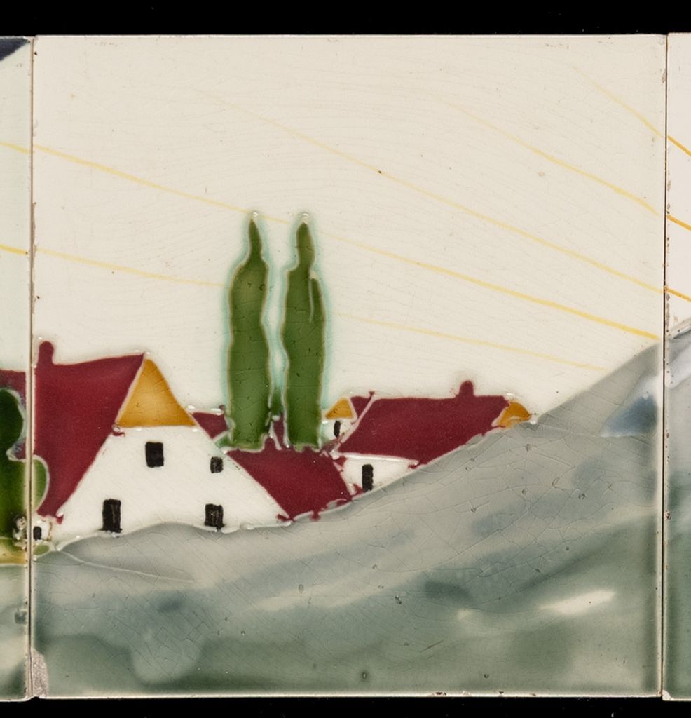 A Stunning Set of Antique German Art Nouveau Ostara Tiles This magnificent set of antique Art Nouveau tiles, manufactured by Ostara in Germany, forms a captivating multi-tile landscape panel. The design features a serene sunrise over rolling hills and a village, executed in the distinctive **tubeline** technique.The scene unfolds across the tiles, depicting a charming village with red-roofed houses nestled among trees on the left, giving way to an expansive mountain landscape in the center. A striking sun, radiating bright yellow rays, is dramatically rising between the peaks. A winding path leads the eye through the pastoral setting. The entire composition is beautifully framed on the left and right by stylized organic motifs of leaves and branches, typical of the Art Nouveau (Jugendstil) aesthetic. The tiles boast a lovely condition with vibrant, clear glazesthat highlight the rich greens, blues, oranges, and creamy white background. The tubeline outlining provides excellent definition and texture to the image. There are only a few minor chips/damages to the edges, which are consistent with the age of these antique pieces and do not detract from the overall striking display.This is a wonderful example of German Art Nouveau ceramic art, perfect for a collector or for adding a period focal point to an interior.