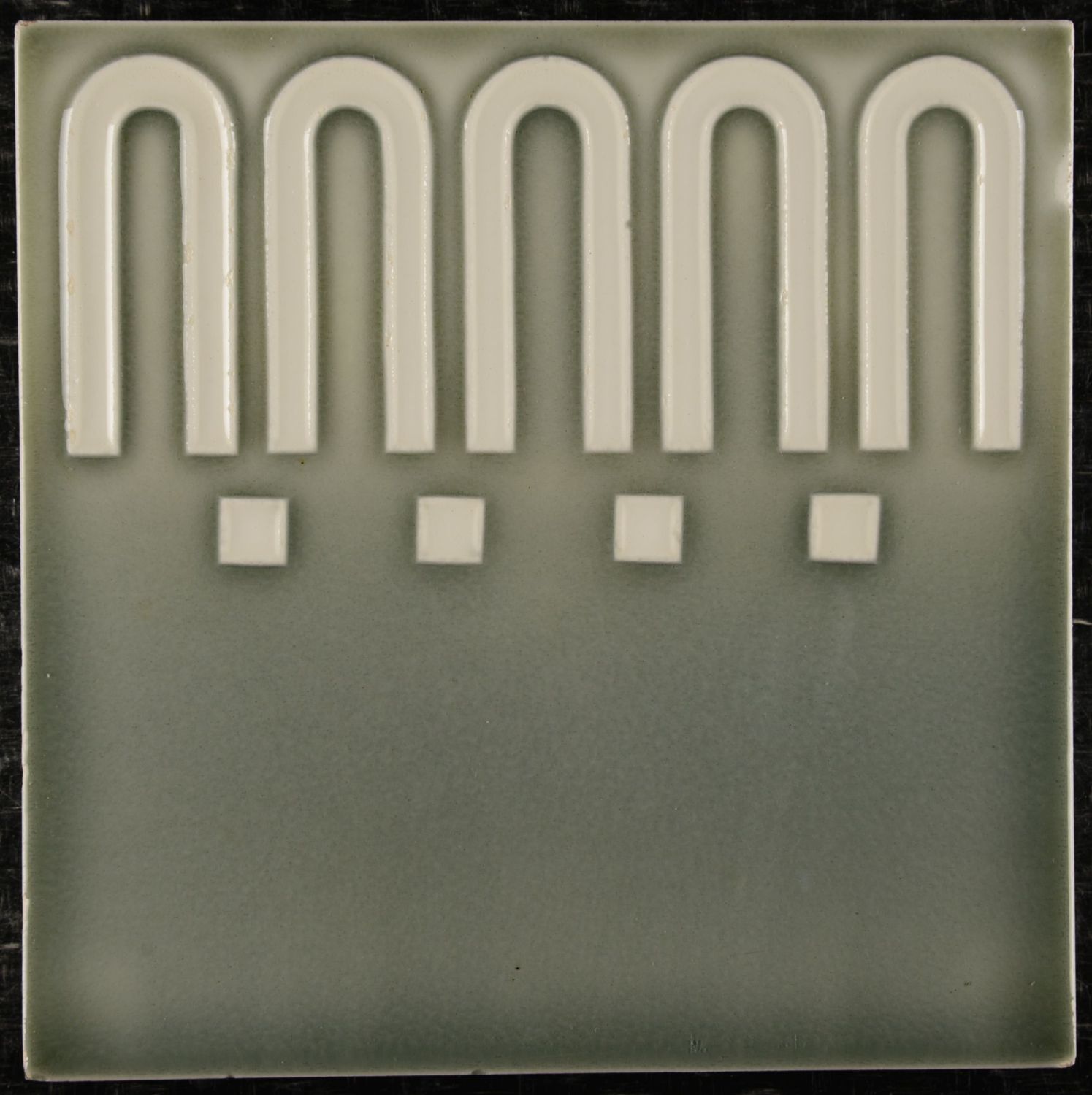 This refined geometric Art Nouveau tile was produced by Tonindustrie Offstein Albertwerke GmbH, Offstein and Worms, a manufacturer celebrated for its high-quality dust-pressed ceramics of the early 20th century. The tile presents a minimalist yet striking Jugendstil design composed of repeated U-shaped relief elements arranged rhythmically along the upper edge. Four small square accents beneath them reinforce the balanced, architectural quality of the composition.The relief is crisp and beautifully executed, rising cleanly from the surface and creating subtle interplay between light and shadow. A softly graduated glaze shifts from pale grey to deeper greenish tones, enhancing the tile’s sense of depth while maintaining a calm, elegant presence. The tile is in very fine condition, with bright, clean glazing.