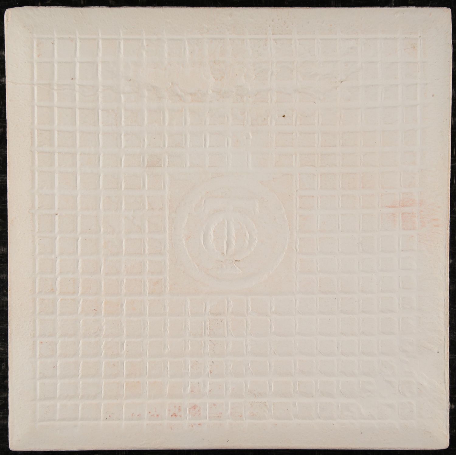 Art Nouveau tile byTonwerk Offstein (Tonindustrie Albertwerke GmbH) in Germany. It is a fantastic example of their "Sjablone Decor" (Stencil Decoration) technique. The motif is a highly stylized, almost abstract depiction of a bird perched on a decorative pot or vase. The tile has imperfections in the glaze on all edges.