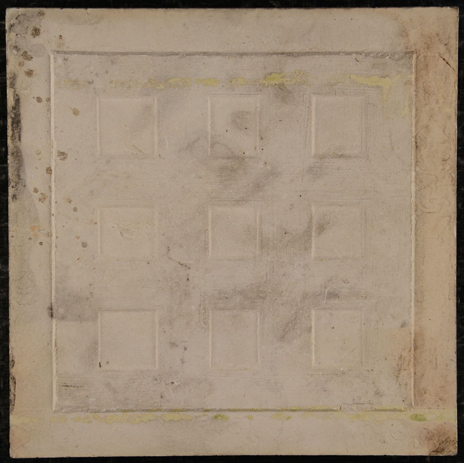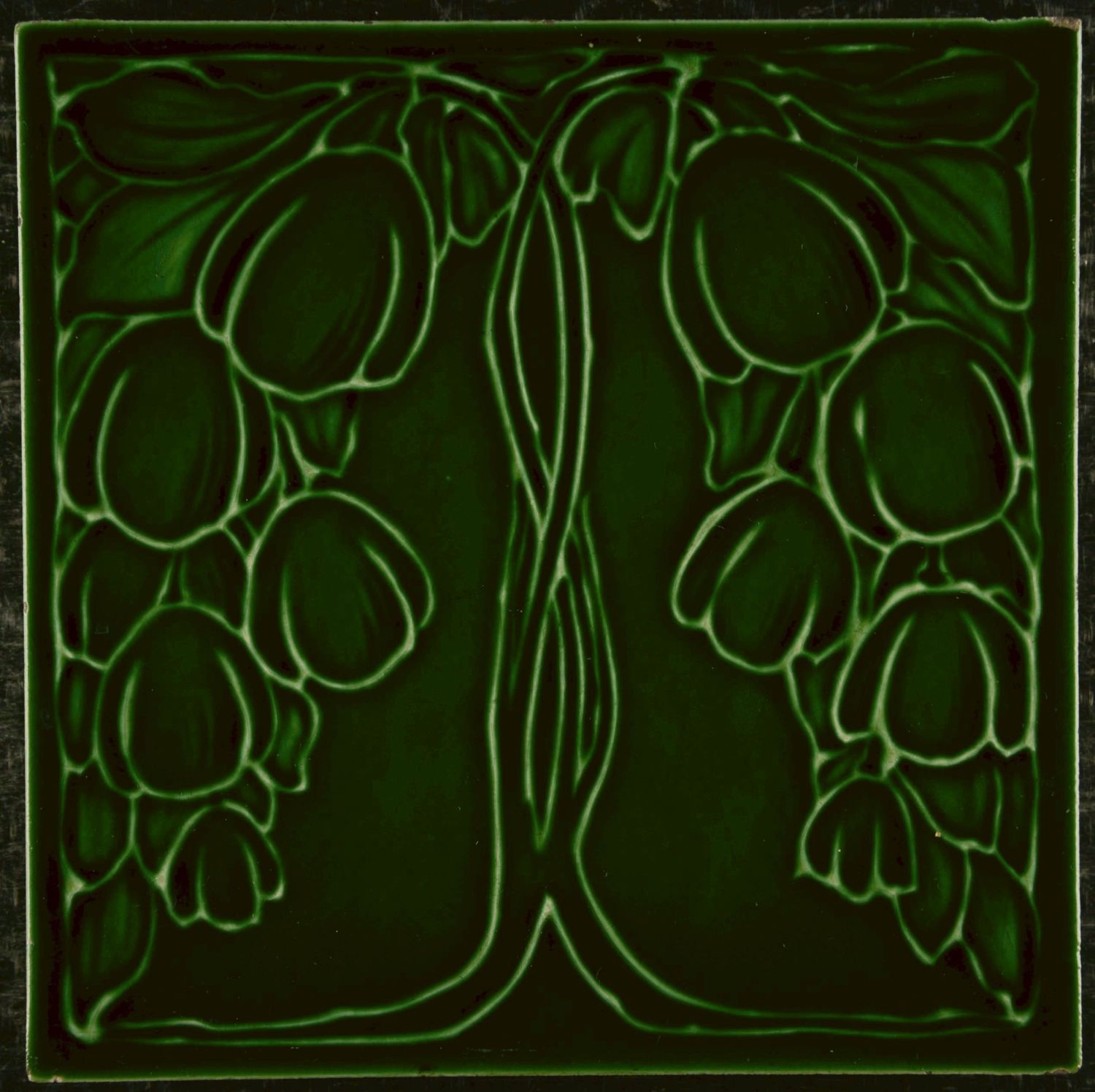 Art Nouveau relief tile, produced by Utzschneider, Sarreguemines region, circa 1900. This square ceramic tile features a symmetrical floral composition rendered entirely in relief and monochrome glaze. The design shows stylised hanging blossoms and elongated stems, arranged mirror-like on either side of a central vertical axis. The flowing contours and softly modelled forms are characteristic of Jugendstil / Art Nouveau, emphasising rhythm, balance, and organic growth.small chips to the corners, otherwise well preserved, with light surface wear consistent with age.