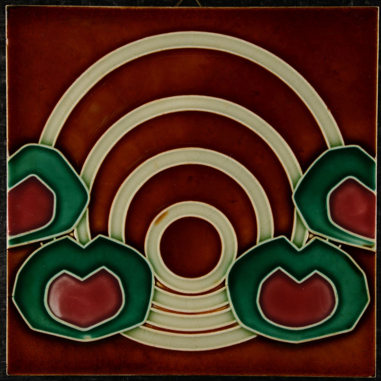 his is a highly characteristic and striking tile from the Norddeutsche Steingutfabrik Grohn (N.s.t.G.), a prominent German tile manufacturer during the Art Nouveau (Jugendstil) period, circa 1900. The tile is dominated by a deep, glossy brown glaze, which serves as the warm backdrop for the geometric-organic pattern. Excellent condition tile.