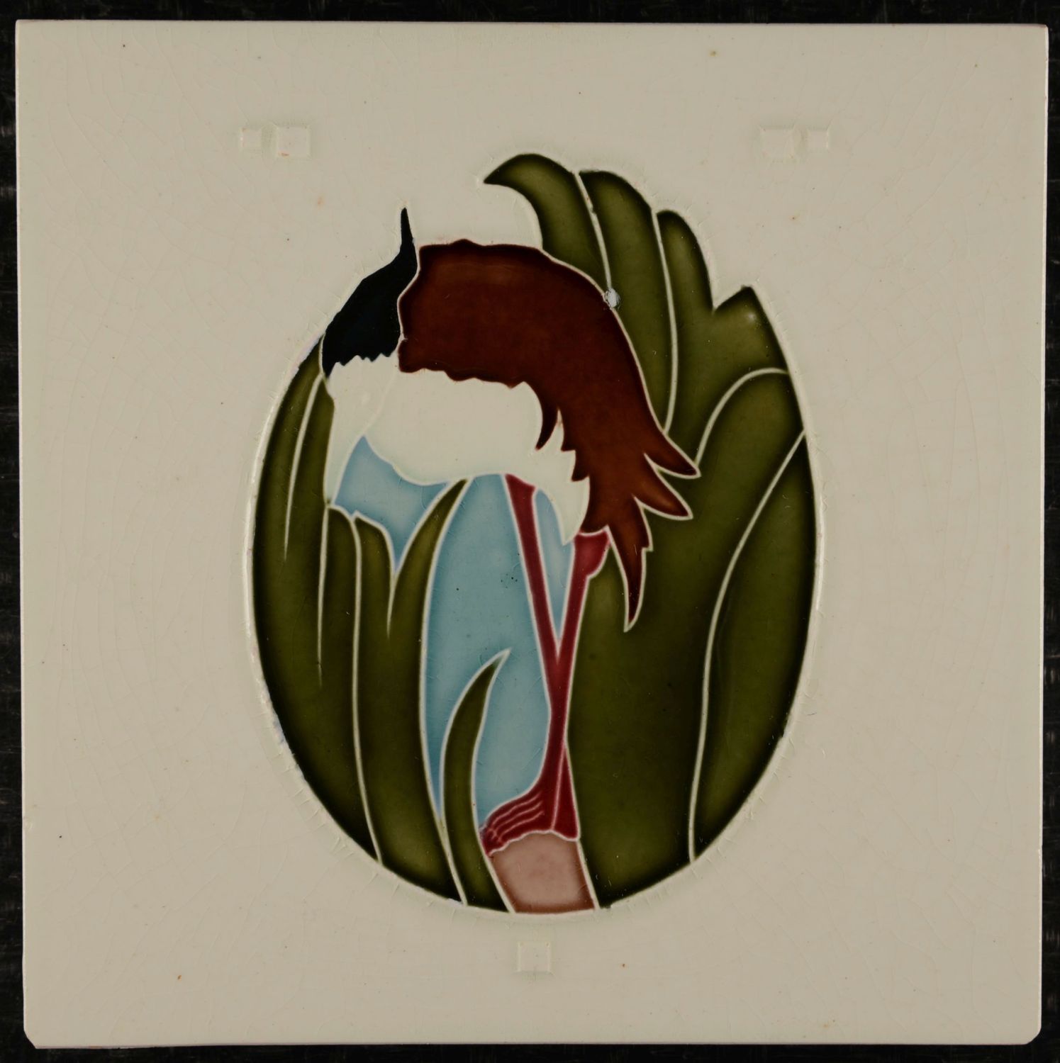 This expressive Art Nouveau tile was produced by Boizenburger Wandplattenfabrik, Boizenburg an der Elbe, a factory founded in 1903 and still active today. Its long-standing ceramic heritage is preserved in the town’s renowned tile museum. The design depicts a stylised wading bird nestled among tall reeds, rendered in soft tonal glazes of olive green, sky blue, brown, and black. The oval framing adds focus to the motif and highlights the organic curves typical of Jugendstil design. The relief is sharply defined, allowing the glossy glazes to settle beautifully into the recessed contours and enhancing the flowing shapes of the composition. The surface shows visible craquelure, consistent with age, and the tile presents damage to the lower corners, though the central image remains unaffected and visually strong.