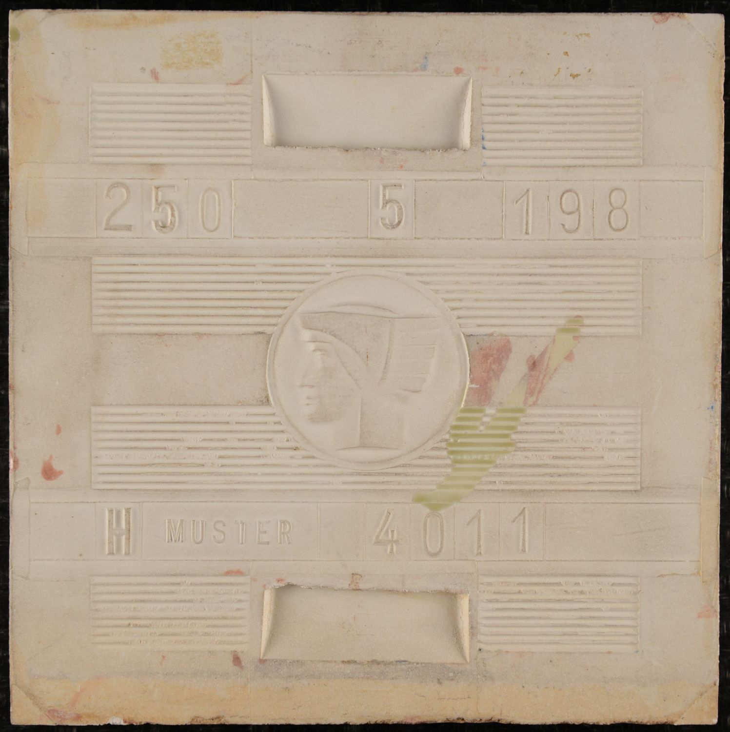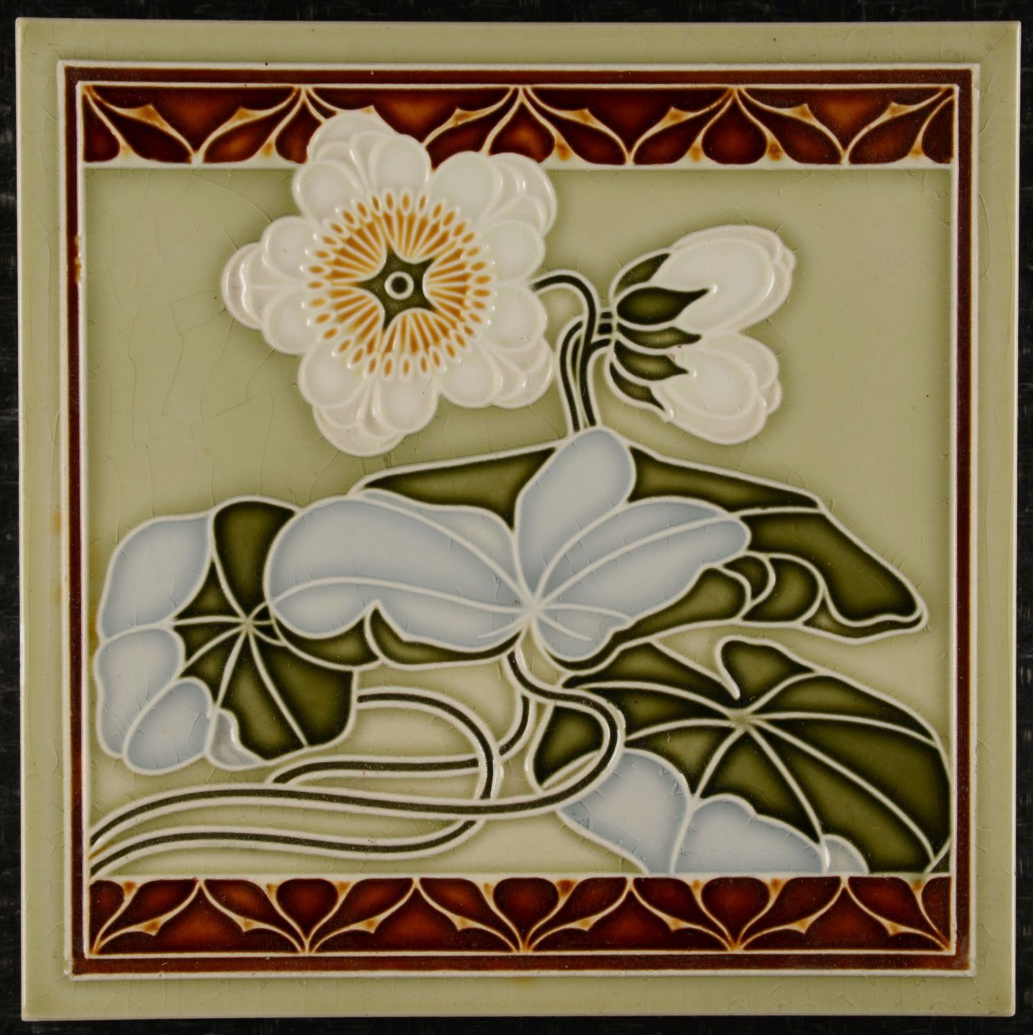 Art Nouveau Relief Tile – Boizenburg (c. 1905) Exceptional Art Nouveau relief tile produced by Boizenburg, made using the dust-pressed technique. The tile features an elegant floral composition with flowing leaves and blossoms, framed by a decorative border. The raised relief gives the design depth and a refined sculptural quality typical of high-quality Boizenburg production. The reverse is clearly marked, including model numbers and the designation “Muster”, confirming it as an original factory example. Condition: Excellent overall, with a well-preserved glaze and crisp relief details; no significant damage observed.