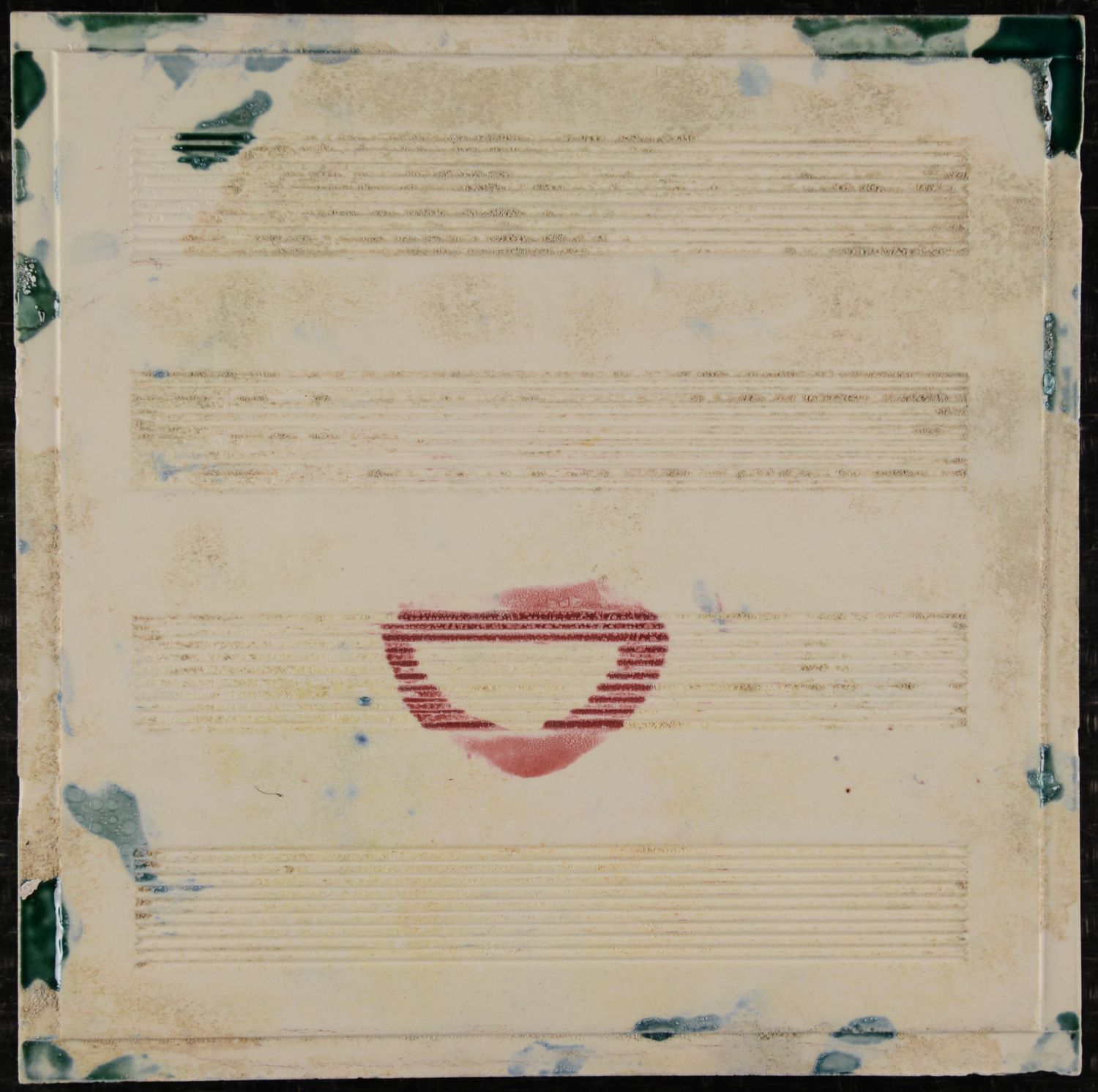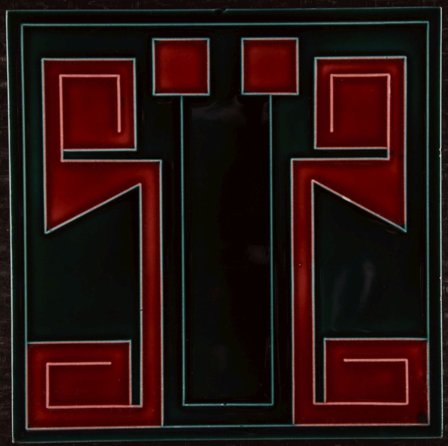 Striking Art Nouveau tile produced by Boizenburg, featuring a bold and highly stylised geometric composition. The design is defined by strong architectural lines and balanced symmetry, executed in deep green with rich red panels. The contrast of colours and the precise linear detailing give the tile a powerful, almost graphic presence. Condition: Very good overall. There are a few small glaze chips, consistent with age and original use, which do not detract from the overall visual impact.