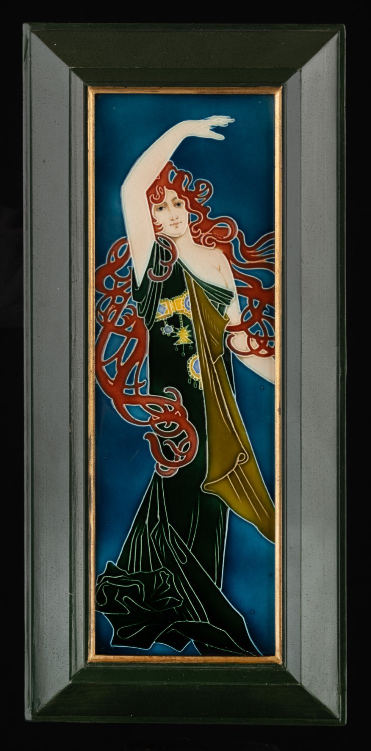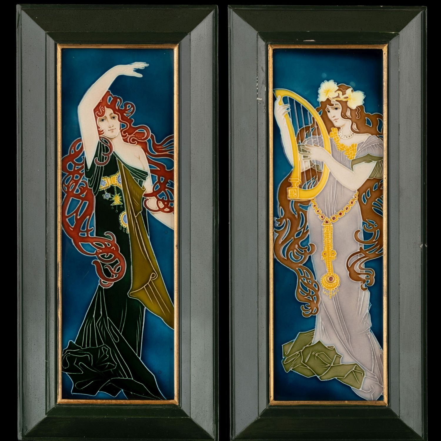 Beautiful pair of Art Nouveau ceramic tiles depicting elegant, elongated female figures in the characteristic flowing style of the Jugendstil movement. One figure is shown playing a harp, while the other poses gracefully with raised arm, both surrounded by stylized, flowing hair and decorative organic forms. The design is by Carl Sigmund Luber, artistic director of the artistic faience department at Johann von Schwarz in Nuremberg. He worked for this company from 1896 until the closure of the artistic department in 1906. The rich cobalt-blue background enhances the finely detailed relief decoration, with subtle shading and vibrant colors including deep greens, warm browns, soft lilac, and golden yellow accents.Both tiles are mounted in a dark green wooden frame with gilt inner borders, ready for display. Very good condition with light, age-related wear consistent with early 20th-century production. The frames show minor signs of use.