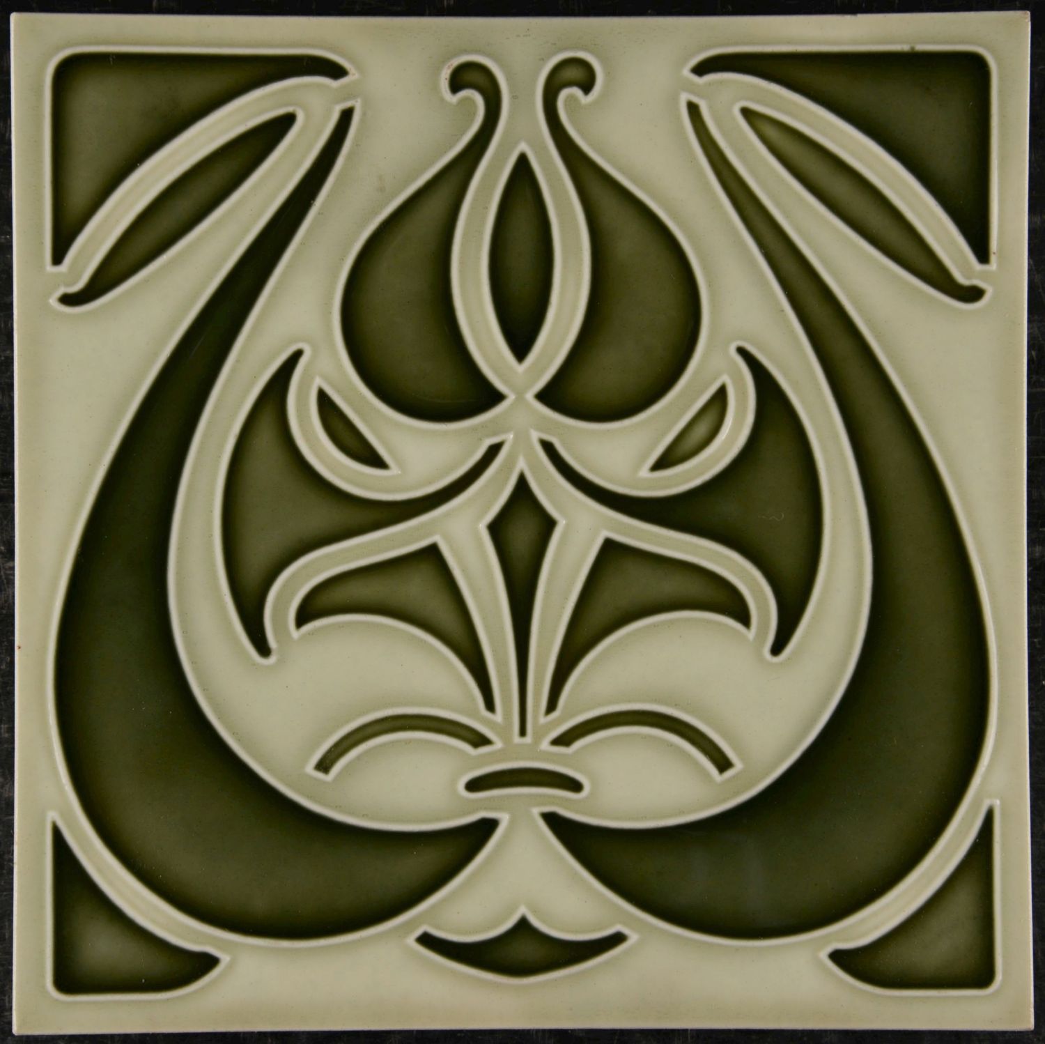 Decorative Art Nouveau ceramic tile produced by Norddeutsche Steingutfabrik (NStG), Grohn, Germany, around 1905. The tile features an elegant symmetrical floral motif rendered in refined relief. Flowing stylized leaves and curved lines form a balanced organic composition typical of the Art Nouveau style. The subtle colour palette of soft cream and olive-green tones enhances the depth of the relief and emphasizes the graceful lines of the design. The tile was manufactured using the dust-pressed technique, in which clay powder is compressed under high pressure in a mould, producing crisp and precise relief details. Perfect condition with no visible damage.