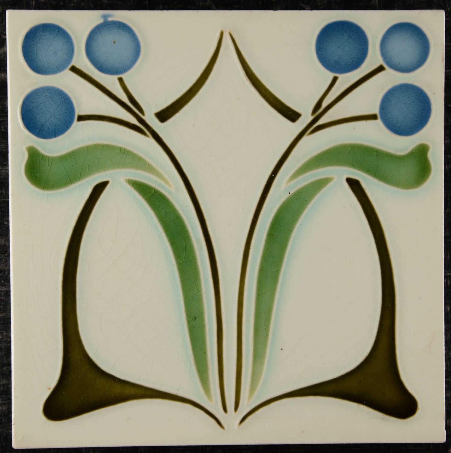 Art Nouveau tile produced by DT-AG Düsseldorfer Tonwarenfabrik AG, a factory established in 1900. The stylized floral decoration with blue berries is executed in relief. The tile is in very good condition. I have come across this design in several different color combinations. The back of the tile marked with DTAG.