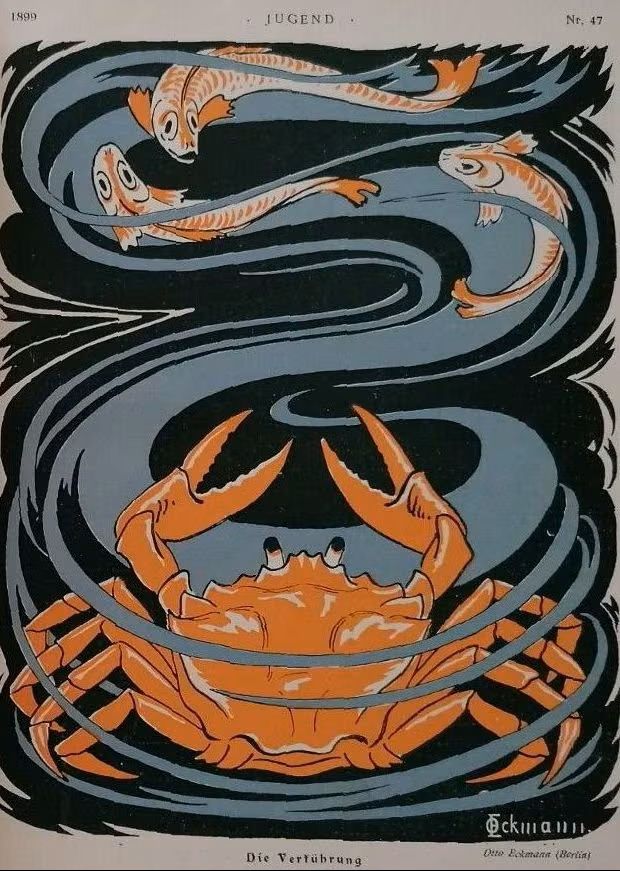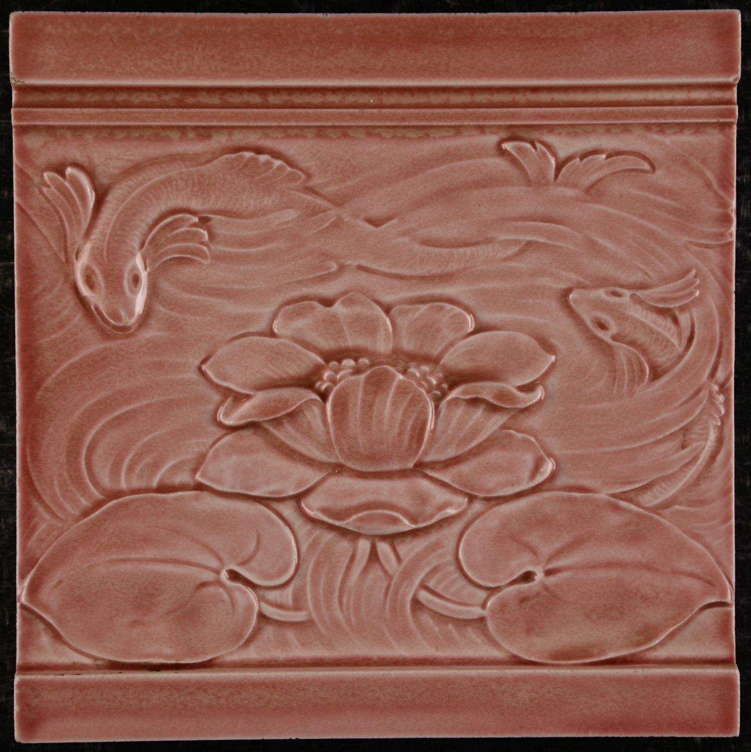 A beautiful Art Nouveau relief tile by S.O.F. Meissen, decorated with an elegant water scene featuring koi fish swimming around a stylised water lily with floating leaves. The decoration in relief was made by compressing clay powder under high pressure in a mold. The fish from Otto Eckmann's woodcut (1899) were used in the design of this tile! Excellent condition tile.