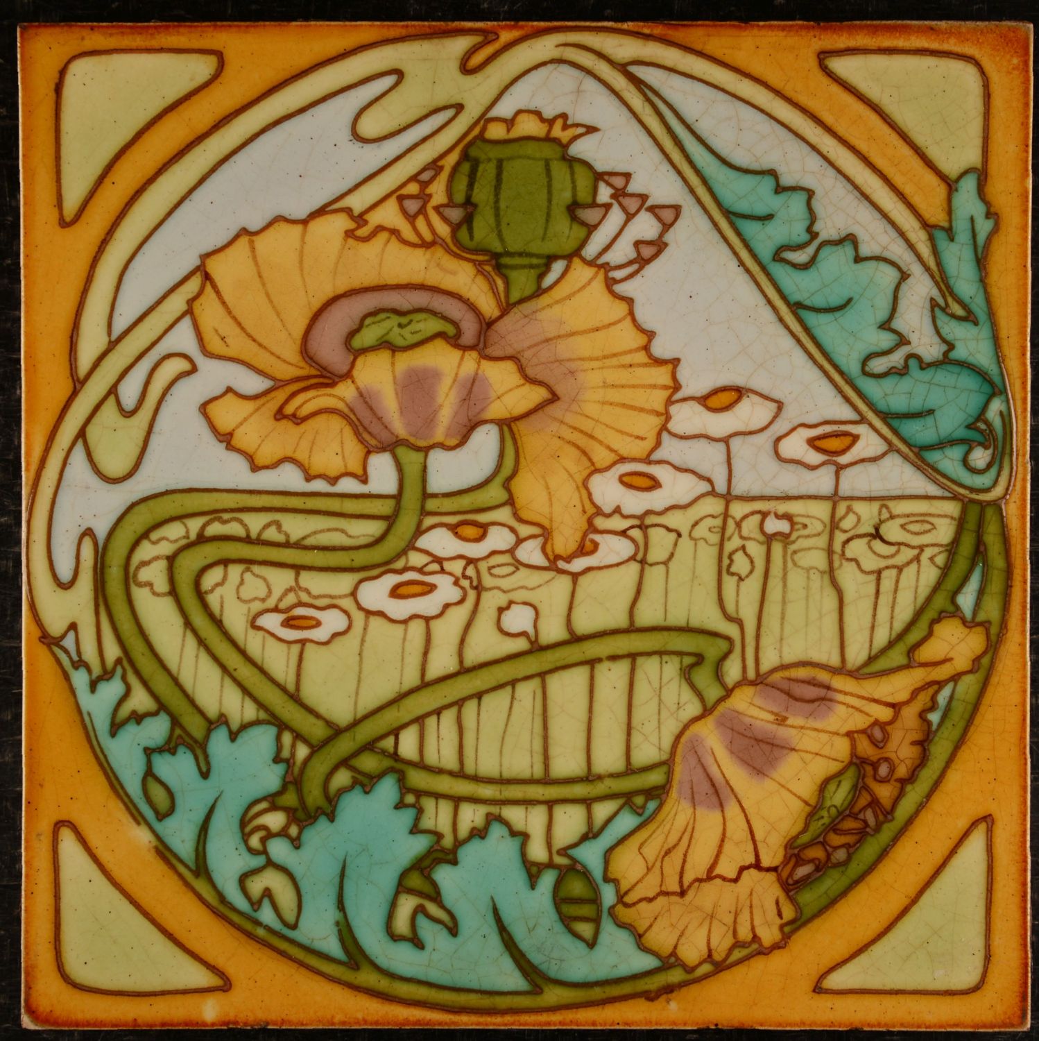 Art Nouveau Tile – Gilardoni & Fils, Choisy-le-Roi, France, circa 1900 Large and beautifully decorated Art Nouveau ceramic tile produced by Gilardoni & Fils, Choisy-le-Roi, France, around 1900. The tile features an elegant floral composition with stylized poppies and seed pods, surrounded by flowing organic lines and decorative foliage. The design is framed within a circular composition set inside a square border, a typical arrangement seen in French Art Nouveau decorative arts. The decoration is executed in the tubeline technique, where raised lines of slip separate the different coloured glazes, allowing the colours to remain clearly defined and creating a subtle relief effect. Very good antique condition with attractive light age-related craquelure, typical for tiles of this period.