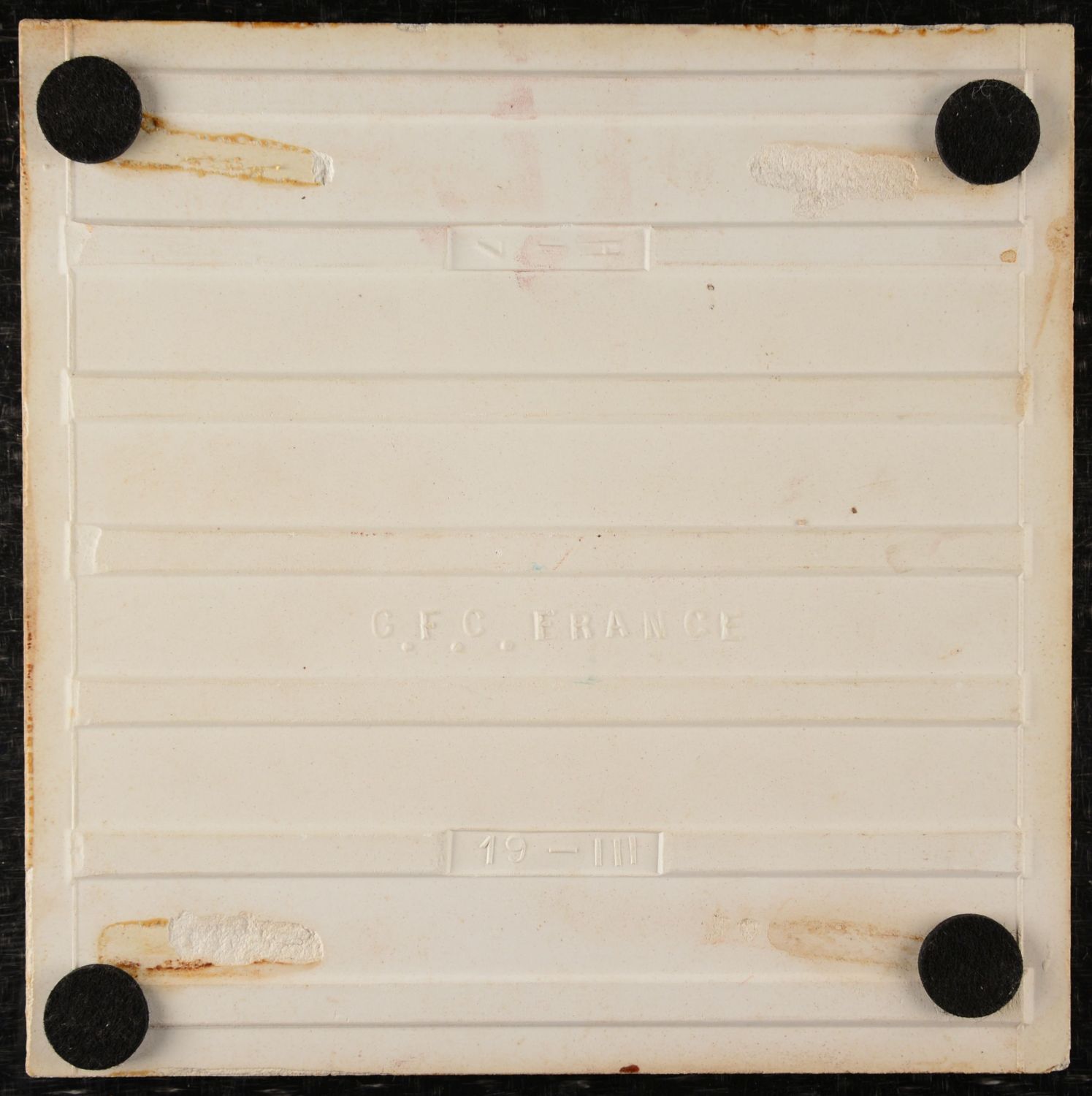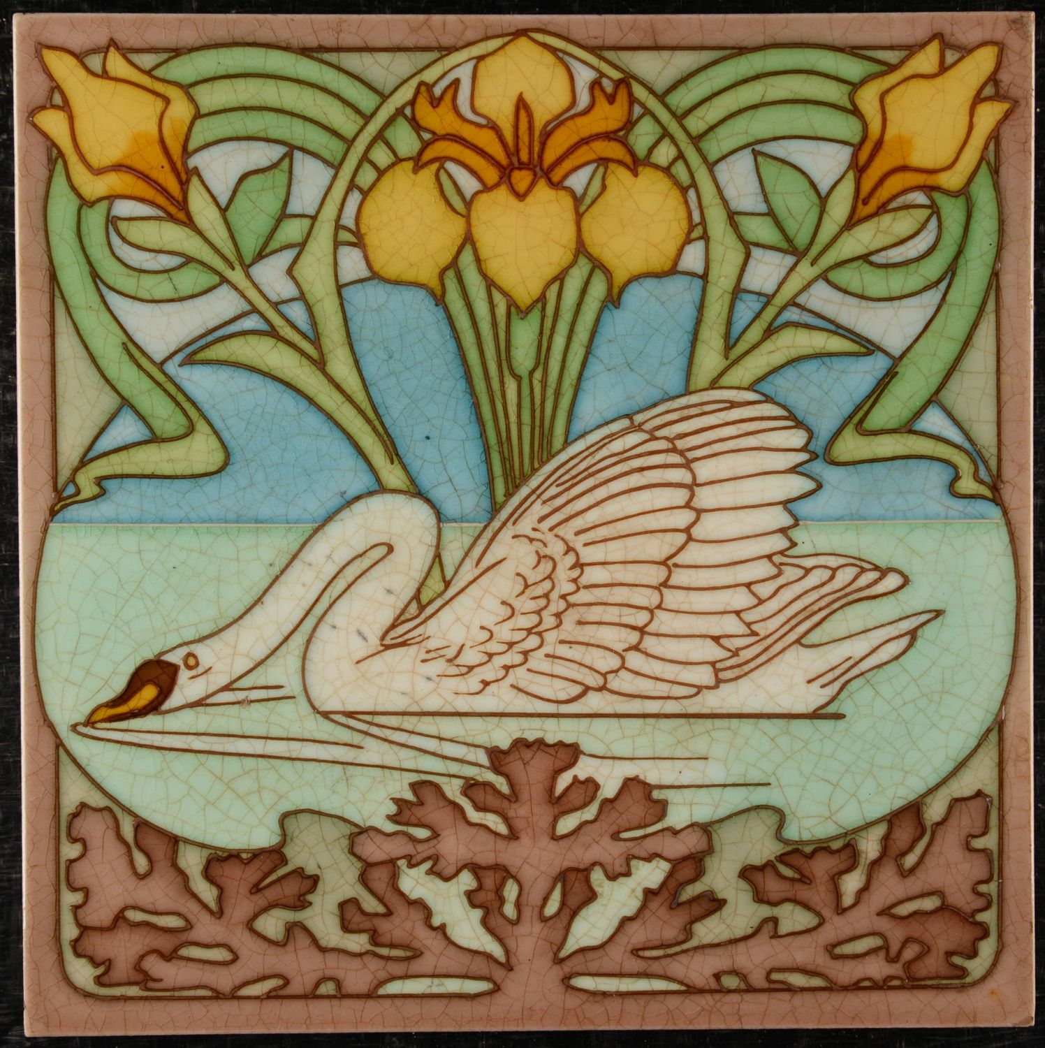 This Art Nouveau ceramic tile, made by Gillardoni, Paris, depicts an elegant swan gliding gracefully across the water. Above the swan, stylized yellow irises rise, their curving stems and leaves creating a harmonious, flowing composition typical of the Art Nouveau style. The design features organic, sinuous lines and soft pastel colors—muted greens, blues, and yellows—outlined in fine brown contours. The lower section shows a decorative pattern reminiscent of water plants or coral, adding balance to the scene. The surface has a delicate crackle glaze, enhancing its antique charm. The decoration was created using the tube-line technique, in which thin clay lines prevent the glaze colors from running into each other.