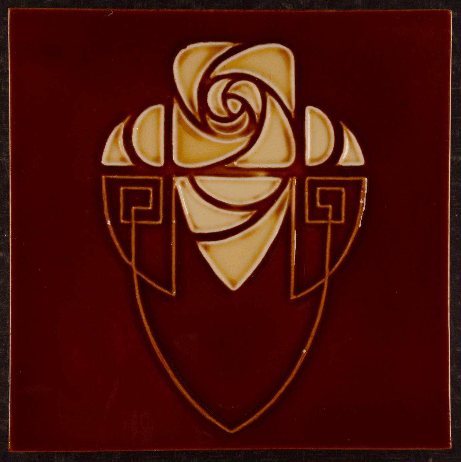 Beautiful original antique Art Nouveau tile produced by Gilliot & Cie (Hemiksem, Belgium), dating to the early 20th century. The tile features a refined stylized rose design, with a swirling rose bloom and geometric floral elements in warm cream and honey tones, set against a rich brown glazed background. The raised relief lines give the pattern depth and a strong decorative character, typical of Belgian Jugendstil ceramics. Condition: unused overall. There is a small glaze chip on the top edge and a few tiny minor imperfections to the relief (see photos). he glaze remains glossy and well preserved.