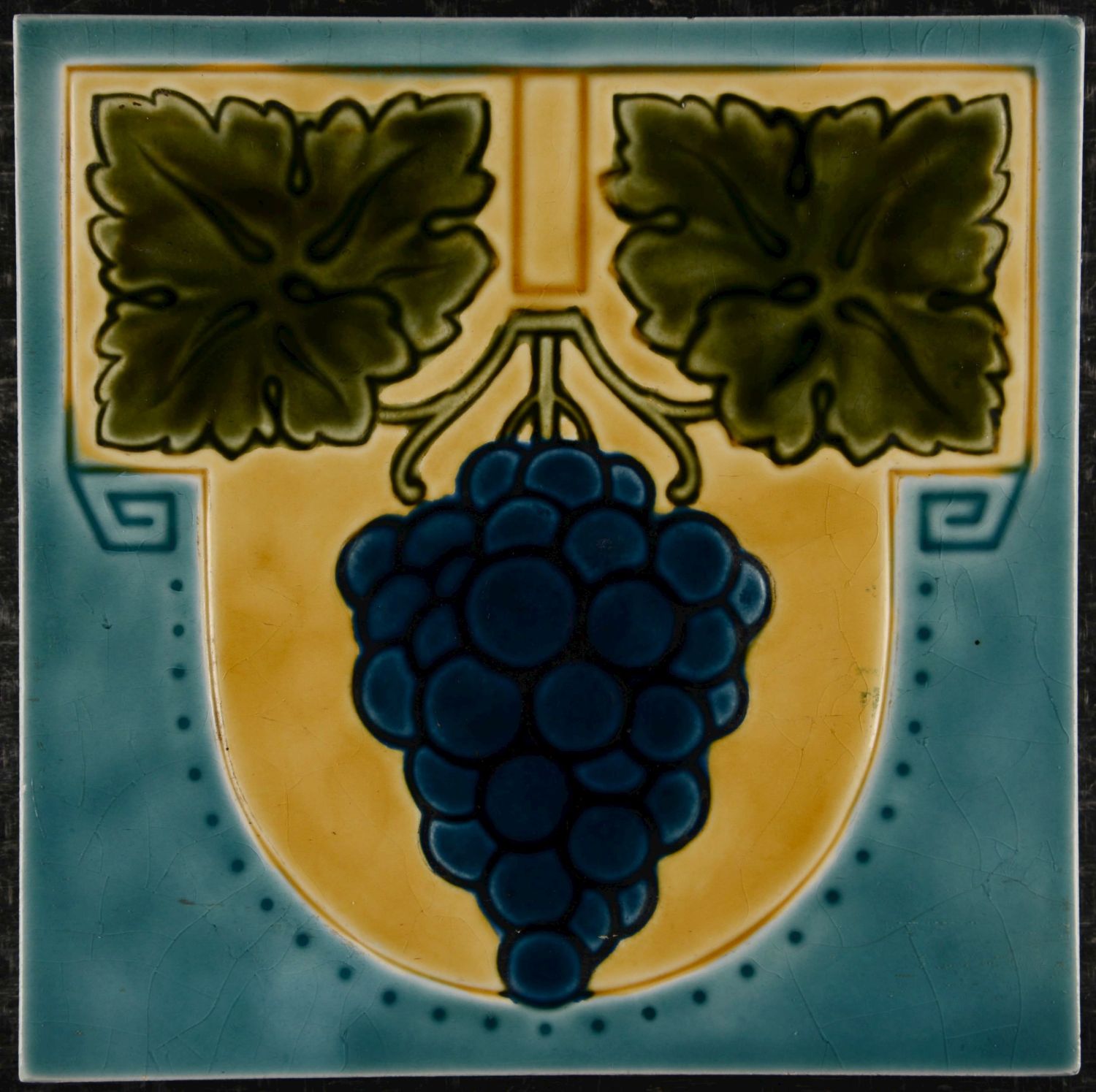 Art Nouveau wall tile, produced by Grohner Wandplattenfabrik, circa 1906–1920. This square ceramic tile features a stylised grape motif, a classic symbol of abundance and nature, rendered in a bold Jugendstil design. At the centre hangs a richly modelled cluster of deep blue grapes, formed in pronounced relief, creating a strong sense of volume and depth. The grapes are suspended from a short stem framed by two large, symmetrical green vine leaves, whose softly contoured forms echo the organic language of Art Nouveau. The tile is executed in moulded relief with translucent, flowing glazes. light wear and fine glaze crazing consistent with age.