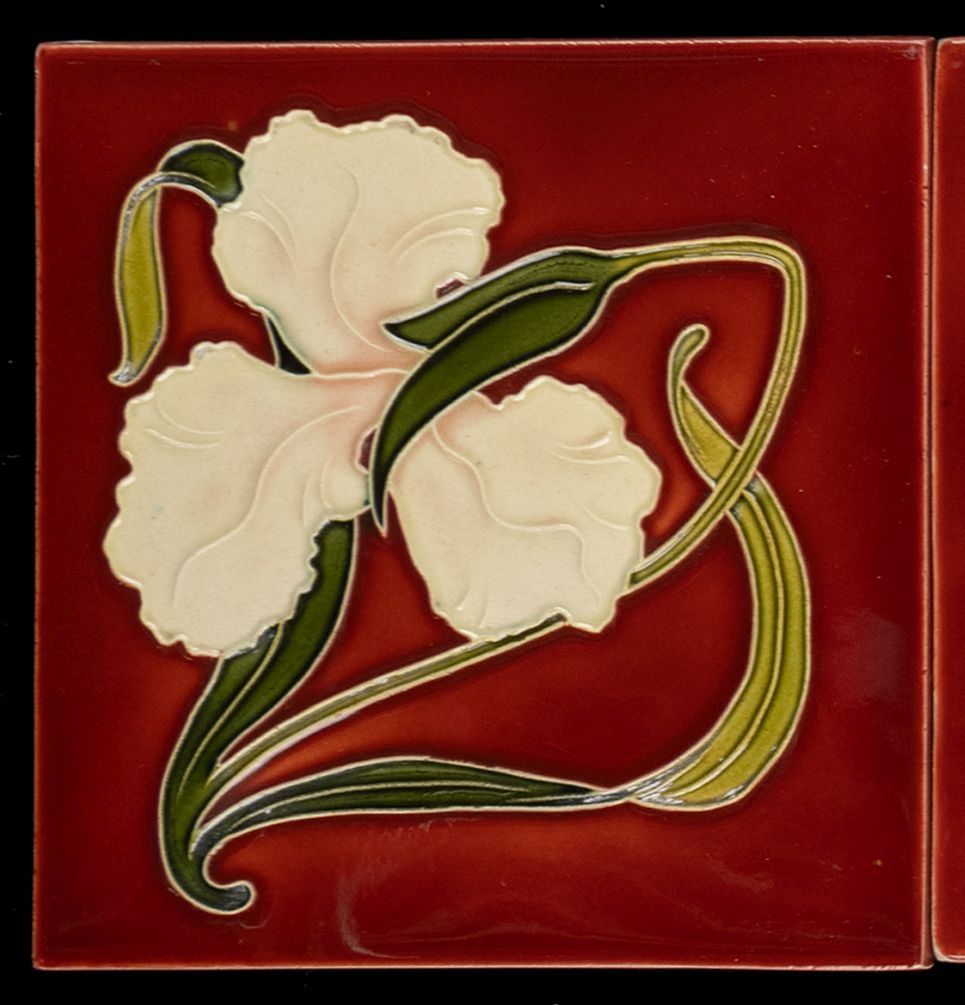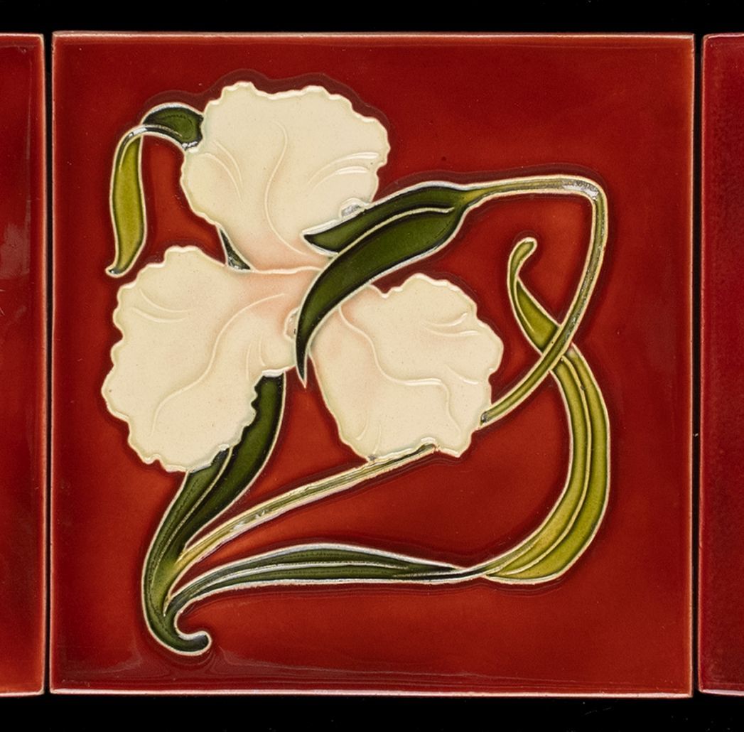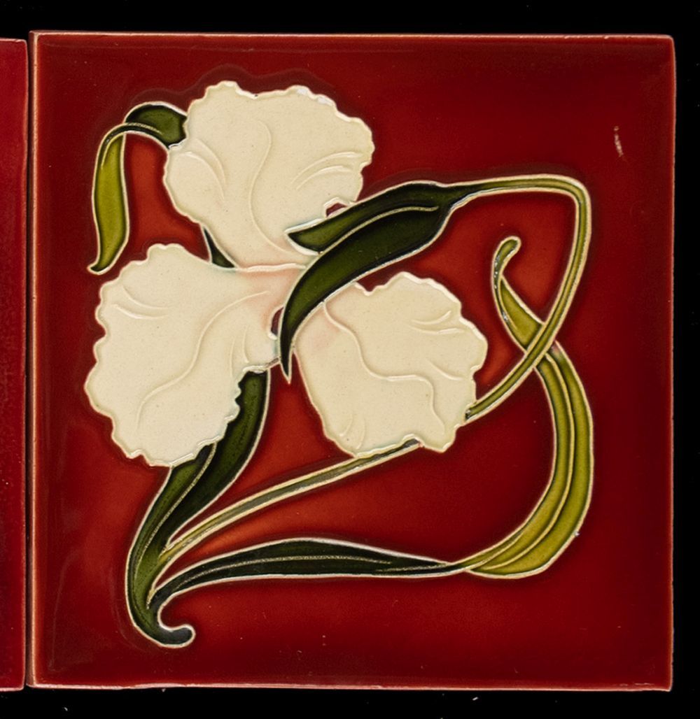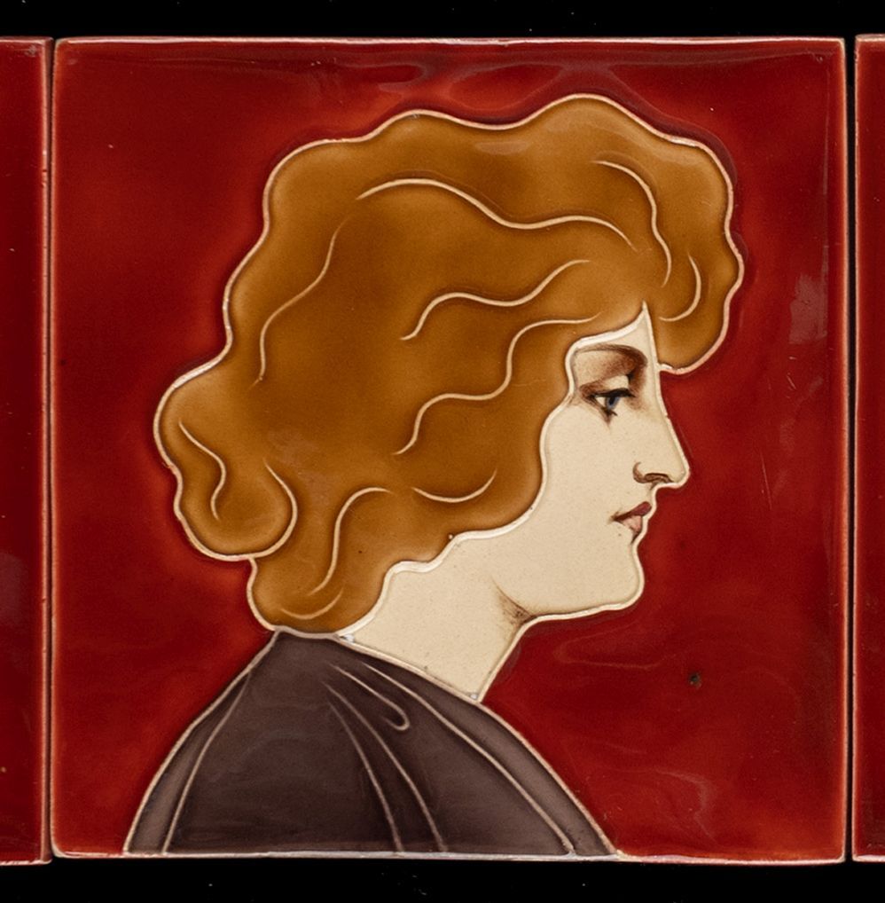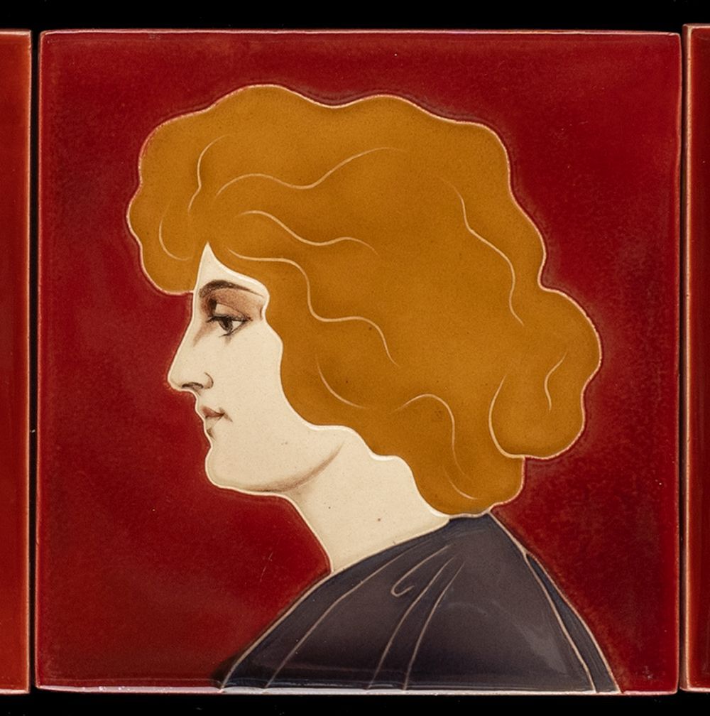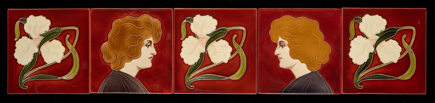 set of 5 art nouveau tiles depicting woman and flowers. The design is by Carl Sigmund Luber, artistic director of the artistic faience department at Johann von Schwarz in Nuremberg. He worked for this company from 1896 until the closure of the artistic department in 1906. These tiles are also pictured in Carl sigmund Luber, his life and work as an artist for the Art Nouveau ceramics of Johann von Schwarz, 1896-1906, published 2006, page 120. The tiles were once part of a piece of furniture. Condition is very fine, with only a few very light scratches to fragile dark red background glaze.