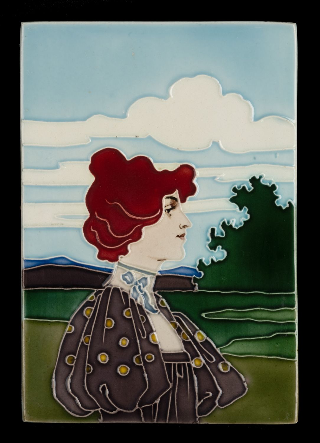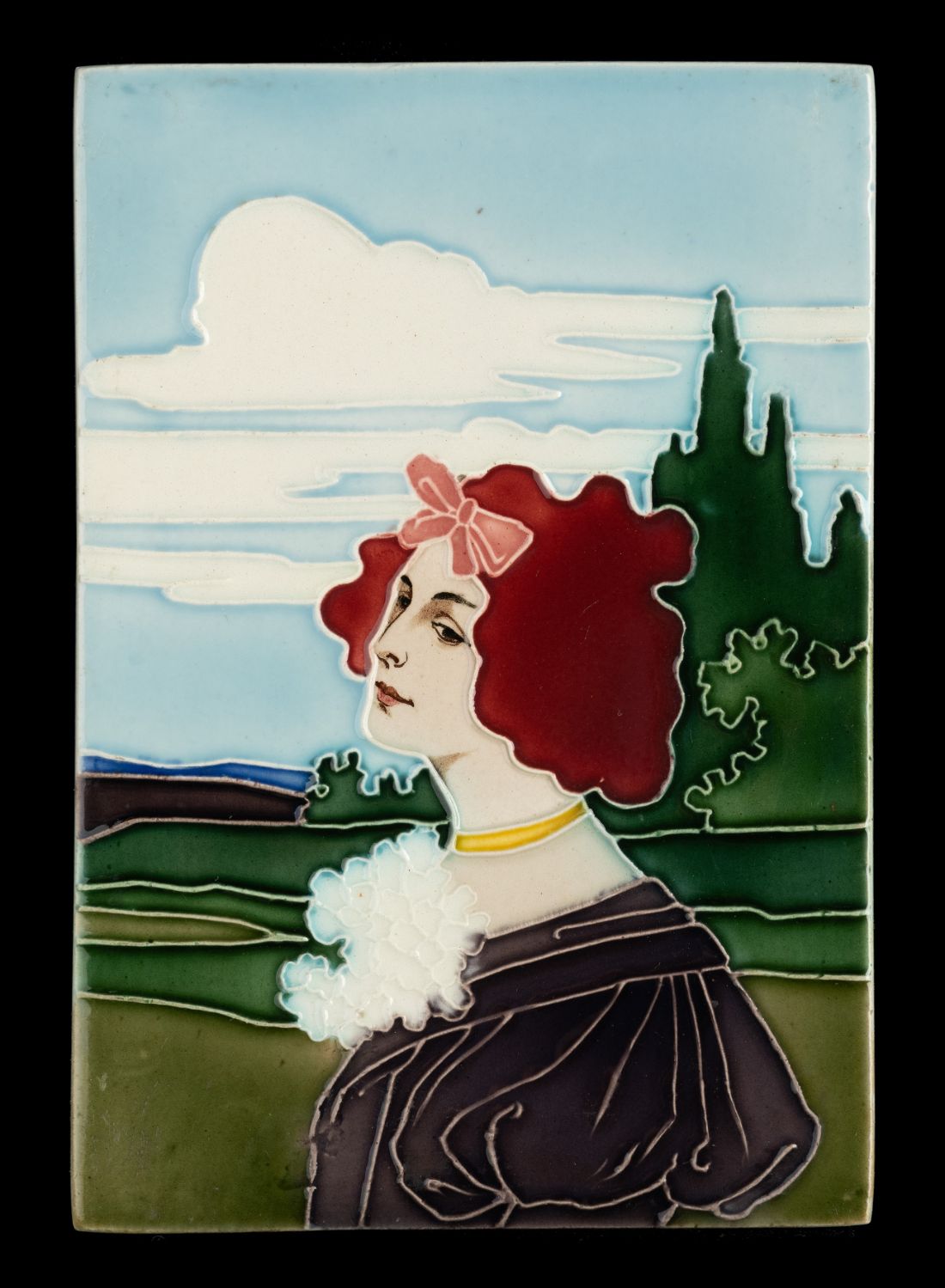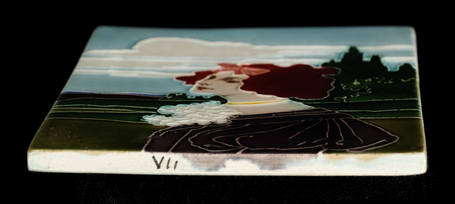 Pair of art nouveau tiles depicting woman in a landscape. The design is by Carl Sigmund Luber, artistic director of the artistic faience department at Johann von Schwarz in Nuremberg. He worked for this company from 1896 until the closure of the artistic department in 1906. The tiles were once part of a piece of furniture. Condition is very fine. Back marked with incised 896 and 897.