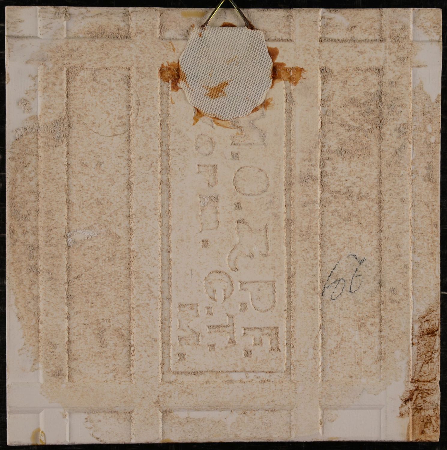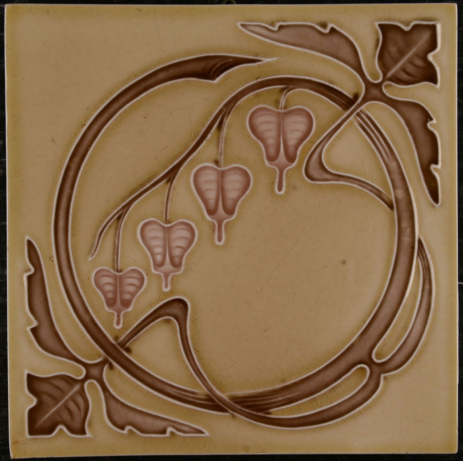 This tile is a delicate example of Art Nouveau floral design from around 1900 made by MPOF, Meissen. The composition is organized around a flowing circular vine that frames the central field. Soft braun stems and leaves create a sense of continuous movement. Hanging from the vine are small heart-shaped blossoms. Raised outlines define the motif clearly and emphasize the relief. The decoration is executed in a finely pressed relief technique. In good used condition, with light age-related wear and traces of lime mortar on the reverse, consistent with former installation.