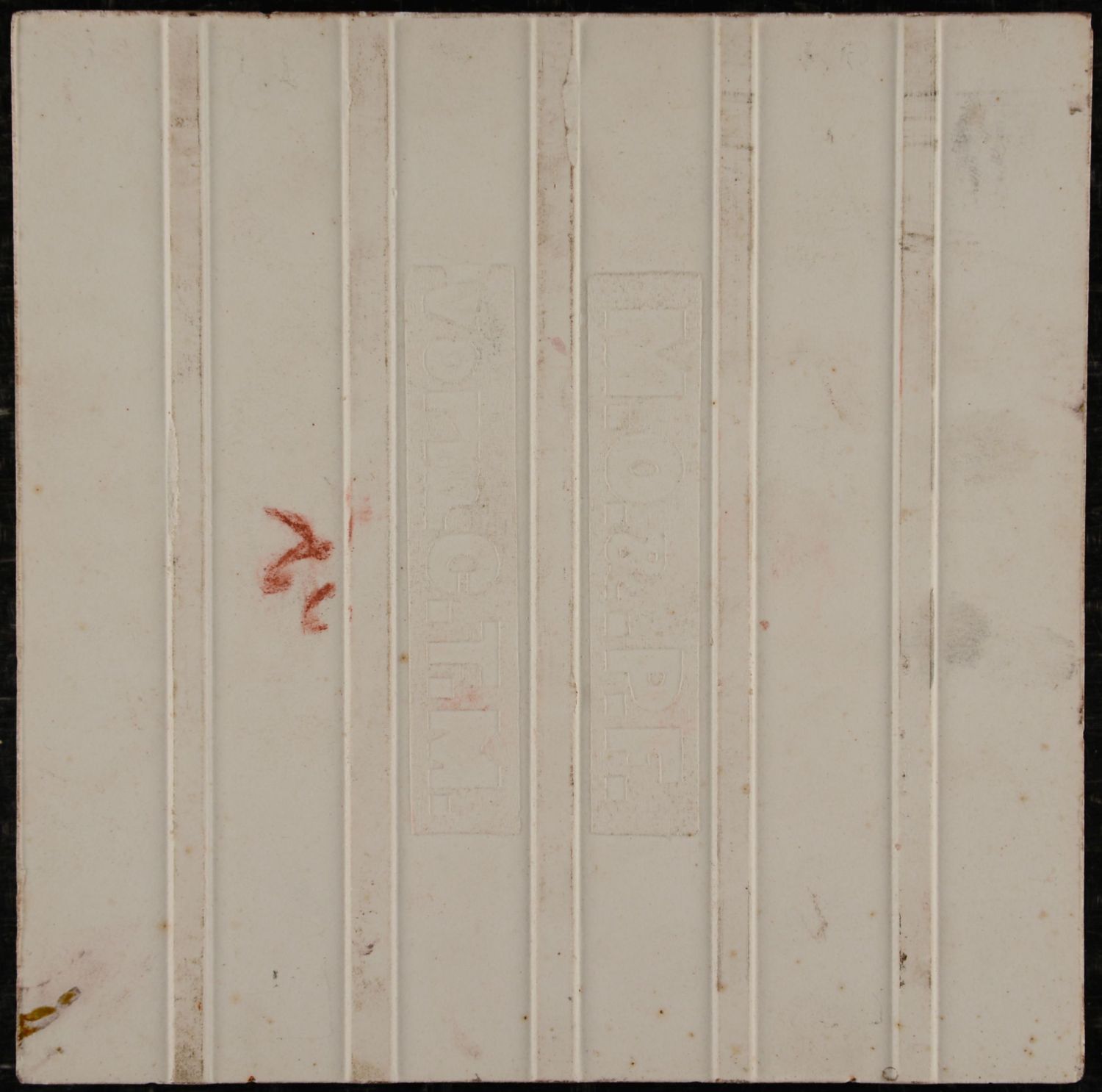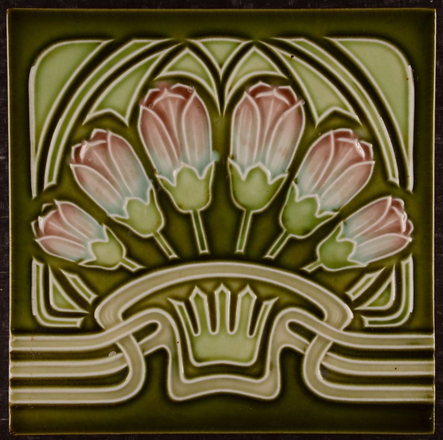This Meissen M.O.& P.F. (Meissner Ofen- und Porzellanfabrik) tile is an outstanding example of Jugendstil floral design in excellent condition. The composition features a symmetrical arrangement of stylized flower buds rising in a graceful fan shape. An arched decorative band frames the flowers and reinforces the balanced composition. Flowing linear elements below add rhythm and a sense of movement to the design. The relief is finely modeled, giving the surface a sculptural yet refined appearance. Glazes are evenly applied and subtly shaded, enhancing depth within the raised forms. No significant wear or damage is visible, underscoring the excellent state of preservation. Overall, the tile exemplifies the high artistic and technical standards of Meissen Art Nouveau ceramics.