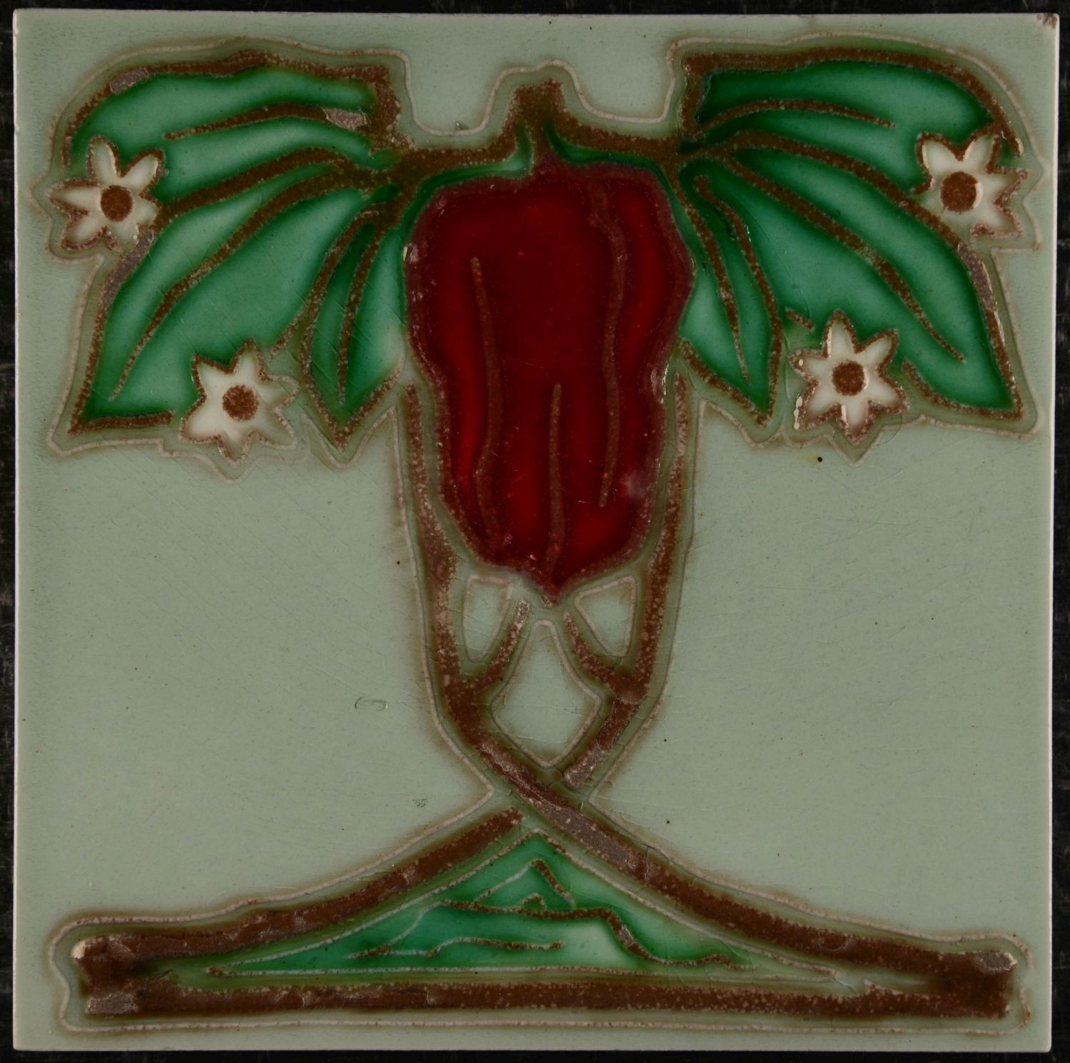 Original antique Art Nouveau tile produced by S.O.F. (Sächsische Ofen- und Schamottewarenfabrik), formerly Ernst Teichert, Meissen, Germany, dating to around 1905. This elegant design features a stylised floral motif with sweeping green leaves and small white blossoms framing a bold deep-red central flower, all set against a soft celadon ground. The decoration was made using the tubeline technique, with raised clay outlines creating crisp separation between the glazes and giving the surface a subtle relief. The tile is in very good condition, with a strong glossy finish and only light, age-related wear such as tine glaze chip to top right corner. The maker’s mark is present on the reverse.