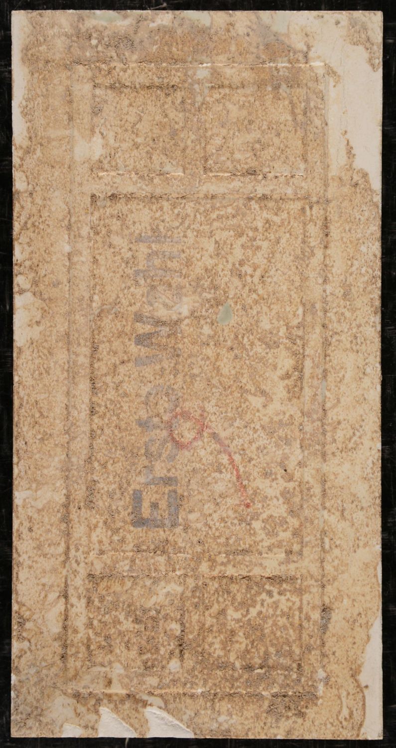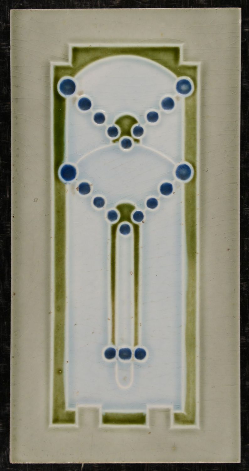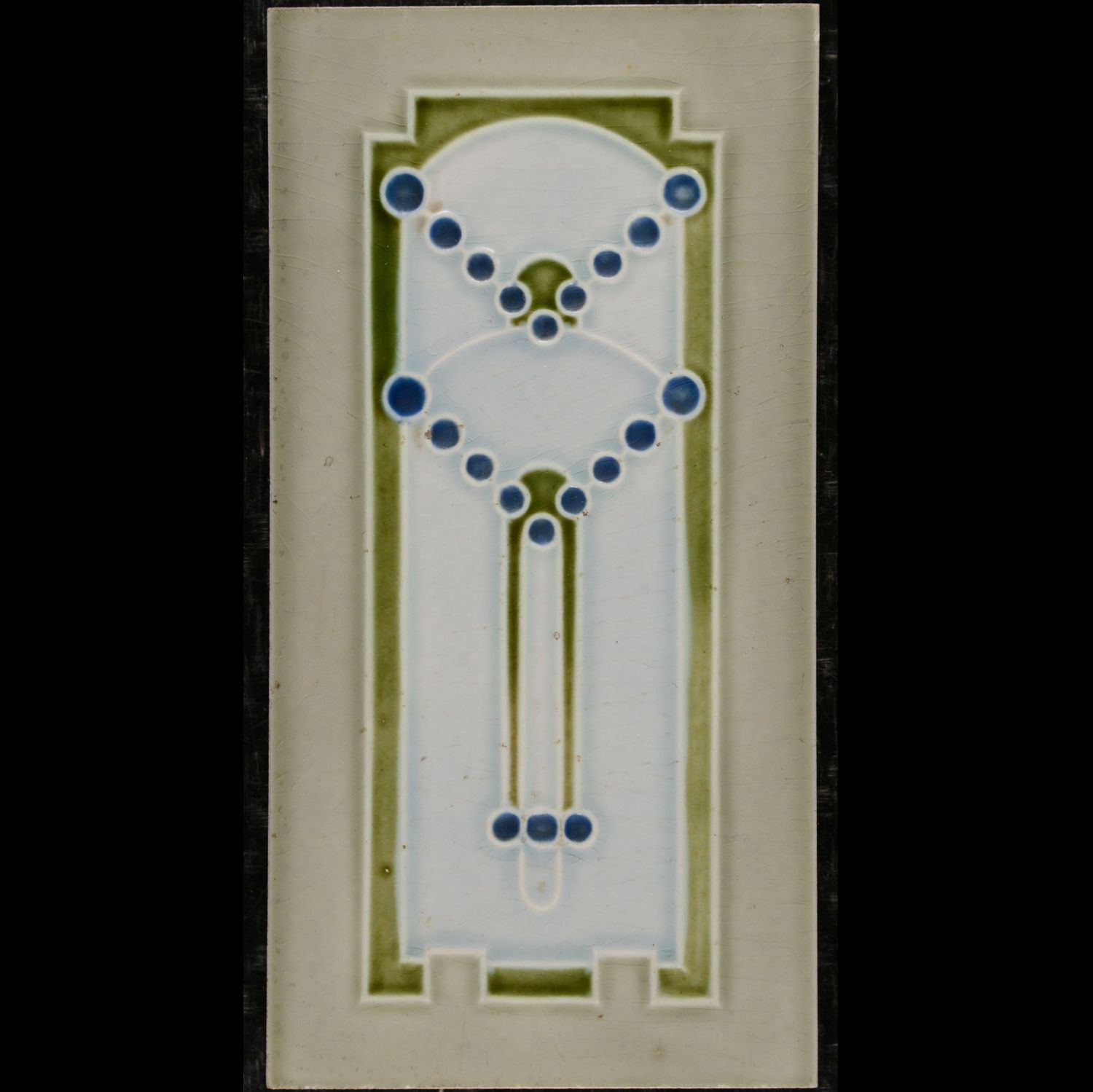 This Art Nouveau tile presents a refined geometric composition that balances elegance and structure. Soft arches and elongated vertical lines form the framework, while a series of small circular blue accents create a rhythmic, jewel-like pattern across the design. Gentle shades of blue and olive green blend into the creamy background, giving the tile a subtle depth and a sense of calm harmony. The design feels architectural yet delicate, with its repeating shapes and measured proportions evoking the thoughtful ornamentation characteristic of early twentieth-century decorative art. Tile by Ofen Porzellan und Tonwarenfabrik Mügeln G.m.b.H. Germany. Tile is in very good condition.