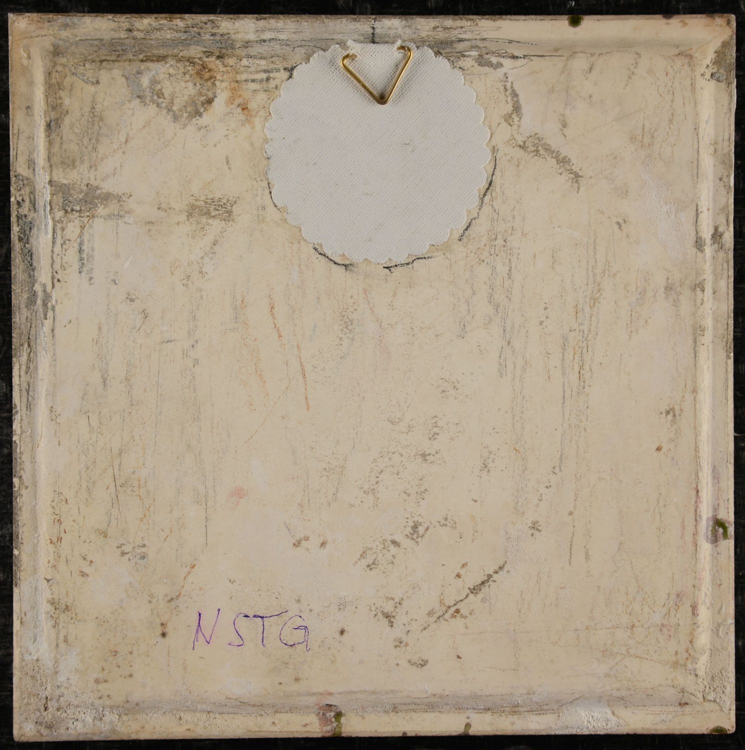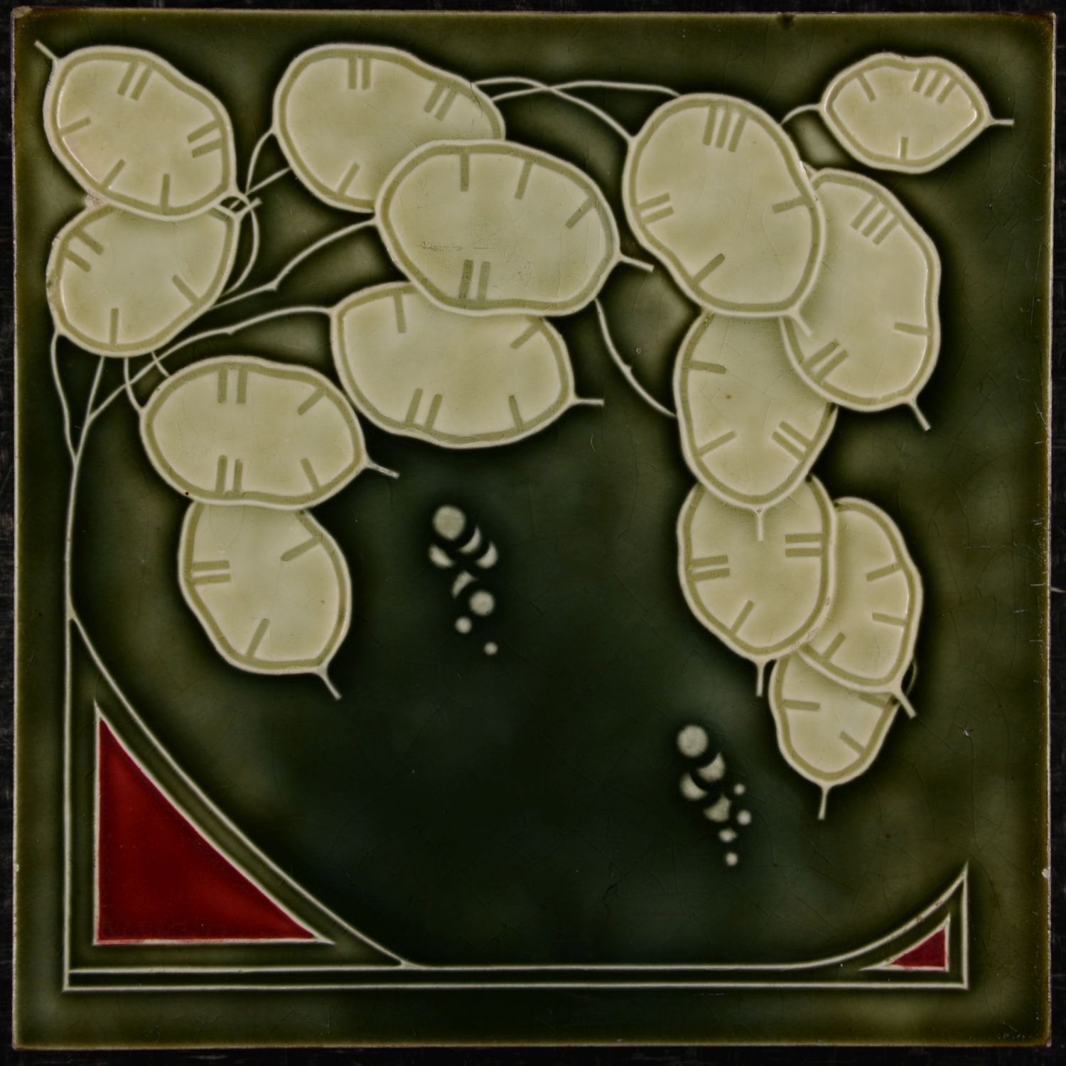 This atmospheric Art Nouveau tile by NstG Grohn features the stylised motif of Judaspenning (Lunaria annua), rendered with elegant simplicity in dust-pressed relief. The delicate, coin-shaped seed pods cascade gracefully across the upper portion of the tile, standing out beautifully against the deep green background. Fine linear markings and slender stems add a subtle naturalistic touch while maintaining the refined abstraction typical of Jugendstil design. Small geometric corner details in rich red provide a striking visual accent and reinforce the balanced composition. The gentle shading of the glaze enhances depth and movement, giving the piece a serene yet expressive decorative presence.The tile shows light signs of age and handling, including fine surface scratches and minor edge chips. These remain modest and do not significantly detract from the overall appearance or clarity of the relief.