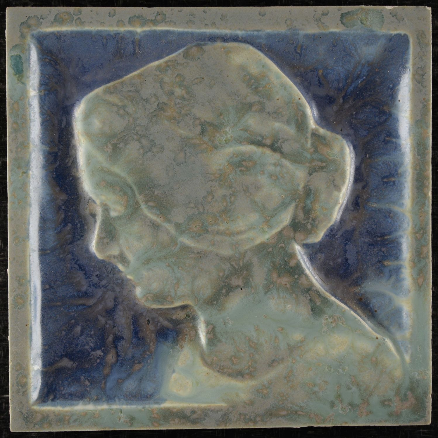 Special Art Nouveau tile featuring a female figure in relief. The relief was created by pressing plastic clay into a mold. After pressing and drying, the tile was finished with an artistic glaze in grey-green and blue — a striking and rare combination. The piece was produced by the Norddeutsche Steingutfabrik in Grohn and is in very condition, apart from a few small flake chips to sides.
