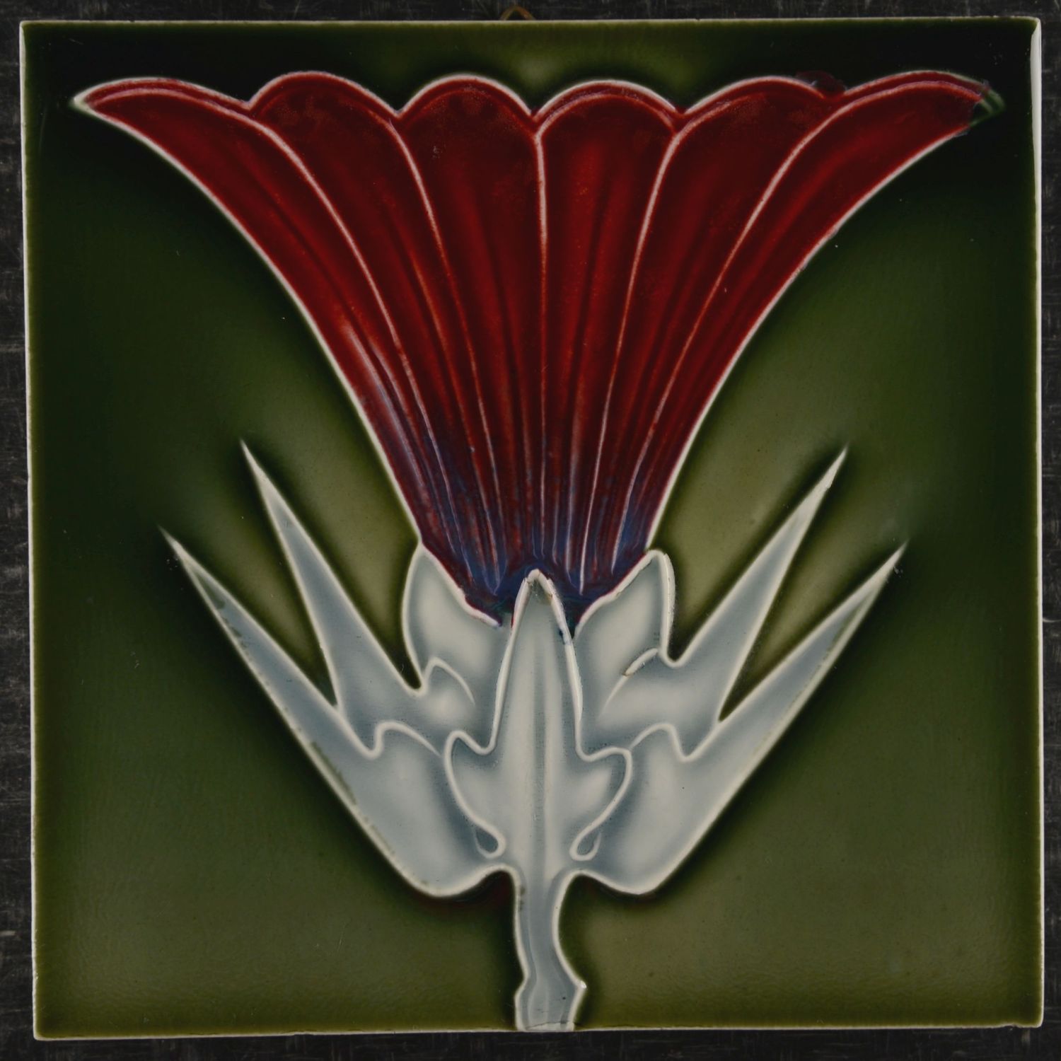 This is an original antique Art Nouveau tile made by: Tonindustrie Albertwerke GmbH, Offstein und Worms, Germany. The tile was made around the year 1900. The decor of floral motifs in red and gray is embossed by Dust-pressed technique in which clay powder is compressed under high pressure in a mold. The tile is in good condition with clear glaze.