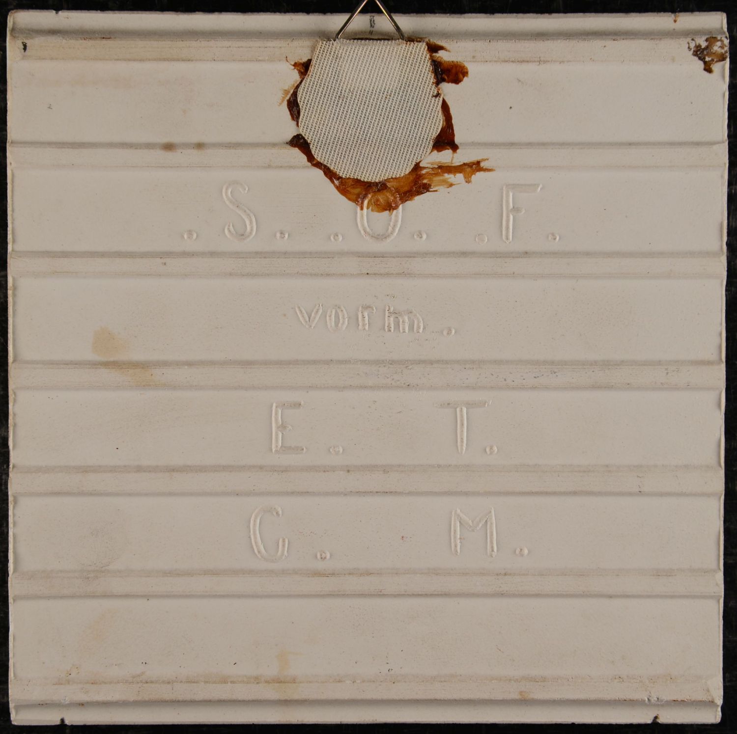 A beautiful Art Nouveau relief tile by S.O.F. Meissen, decorated with an elegant water scene featuring koi fish swimming around a stylised water lily with floating leaves. The soft green ground, combined with delicate pink accents and warm ochre tones in the flower, creates a calm and refined composition with great depth. The decoration in relief was made by compressing clay powder under high pressure in a mold. The fish from Otto Eckmann's woodcut (1899) were used in the design of this tile! Good condition tile with light traces of use, such as a few tiny glaze chips.