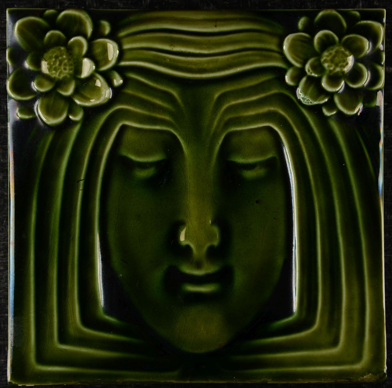 This is an exceptional and iconic example of an Art Nouveau (Jugendstil) tile, likely produced by the Sächsische Ofen- und Schamottewarenfabrik, formerly Ernst Teichert, Meissen (S.O.F.). The tile is dominated by the woman's head rendered in deep relief. Her eyes are closed in a serene or meditative expression, evoking a sense of calm and introspection. On the upper left and right sides of the head, two stylized flowers are placed in relief (possibly daisies or asters). These flowers literally integrate the woman with nature, a fundamental principle of Jugendstil. Unfortunately, it is not in perfect condition; the bottom of the tile has been restored by a few millimeters.