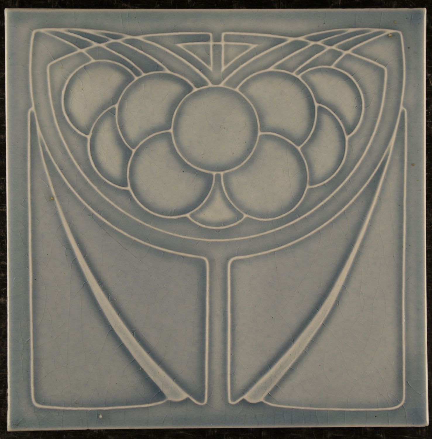 Elegant Art Nouveau ceramic tile produced by Servais Werke, Ehrang, Germany, around 1905. The tile features a stylized floral motif, framed by flowing, symmetrical lines that create a harmonious and almost architectural composition. Executed in relief with a soft, monochrome grey glaze, the tile has a refined and understated appearance. Good antique condition with light craquelure consistent with age.