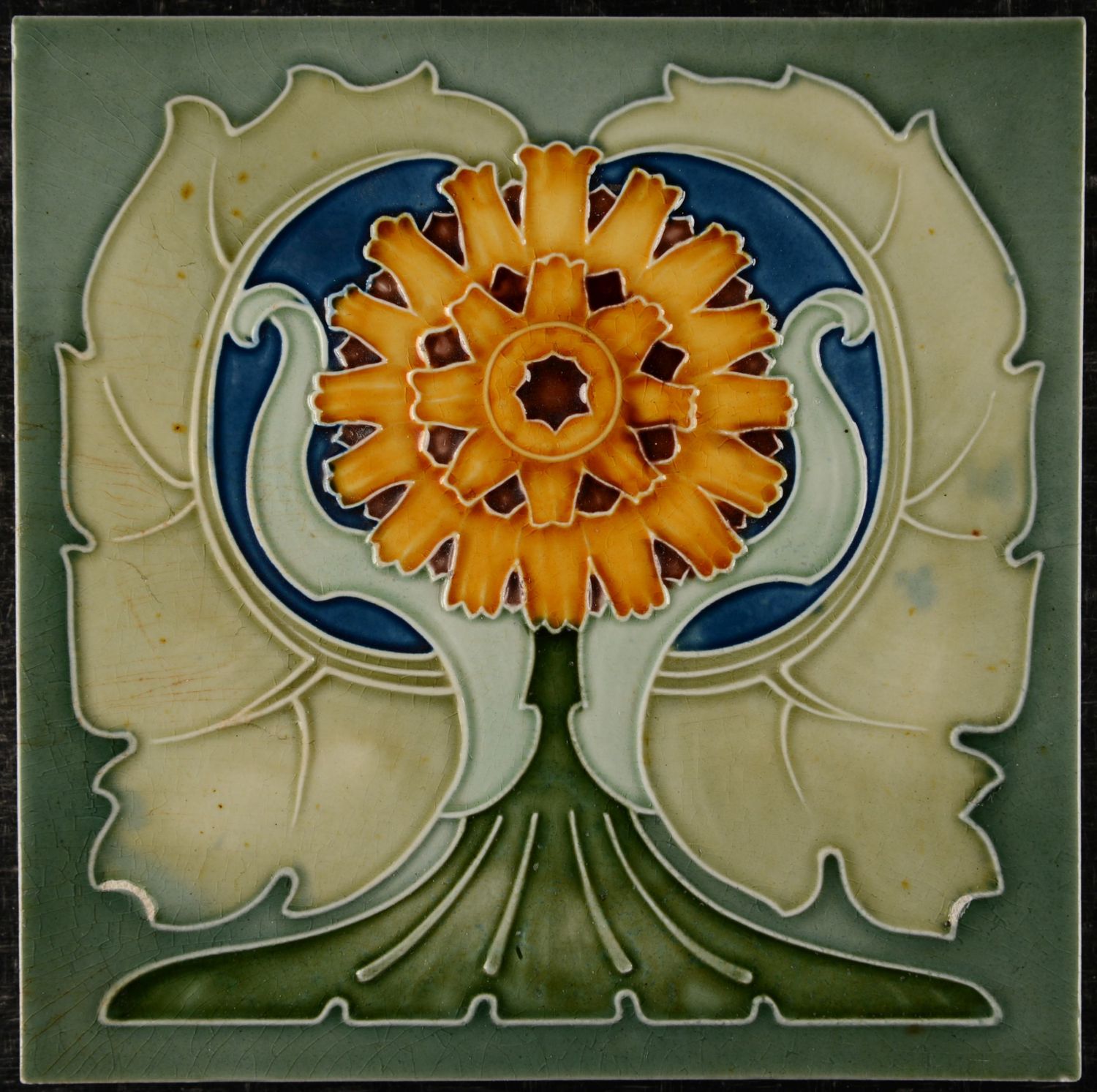 Highly decorative Art Nouveau tile that is characteristic of the style produced by S.O.F. (Sächsische Ofen- und Schamottewarenfabrik) in Meissen, Germany, around the turn of the 20th century. The tile showcases a striking stylized floral motif rendered in relief and enhanced by a beautiful polychrome glaze application. Dominating the center is a bold, sun-like flower, its petals radiating outward in a rich ochre or deep golden yellow, with a darker, brownish center. Behind the central flower, a strong cobalt blue crescent provides a dramatic, contrasting backdrop, making the yellow immediately pop. Below, the stalk and basal leaves merge into a deeper forest or moss green, completing the naturalistic yet highly ornamental composition. The tile appears to be in good antique condition, exhibiting the desirable fine crazing across the lighter glazed areas, which is typical for tiles of this age and production method, but the relief remains sharp and the colours are wonderfully preserved, presenting a magnificent example of German Jugendstil ceramic art.