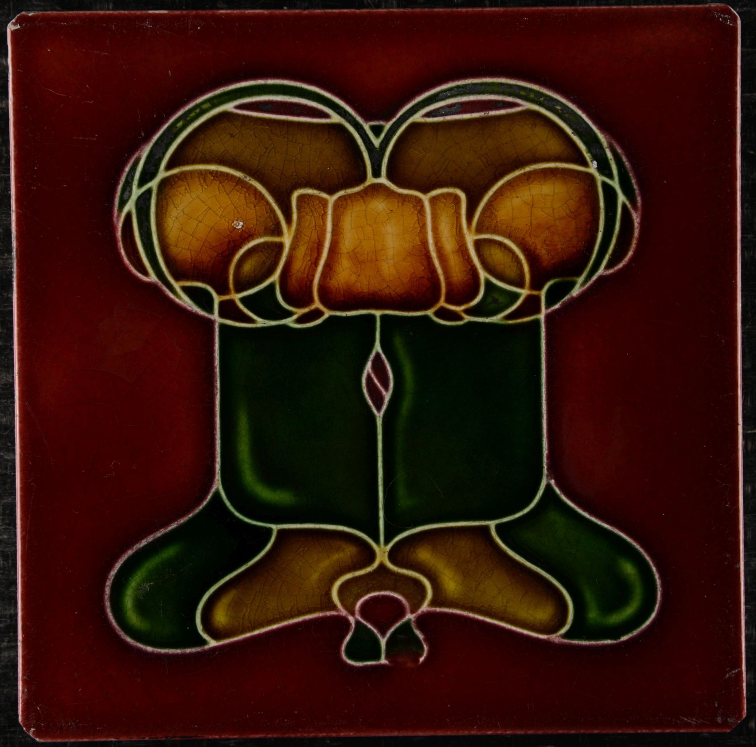 This is an antique Art Nouveau relief-moulded tile, manufactured by T & R Boote in Burslem, England, around 1900. The tile features a highly stylized, symmetrical design typical of the Art Nouveau period, possibly representing a simplified floral or organic motif. The decoration is created using the dust-pressed relief technique, where clay powder is pressed into a mould to create the raised (embossed) pattern. The corners have been cut off so that the tile can be fixed into a washstand cabinet, which was common practice in England.