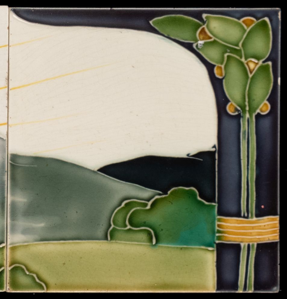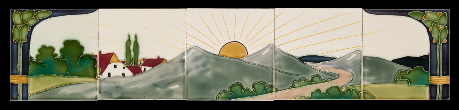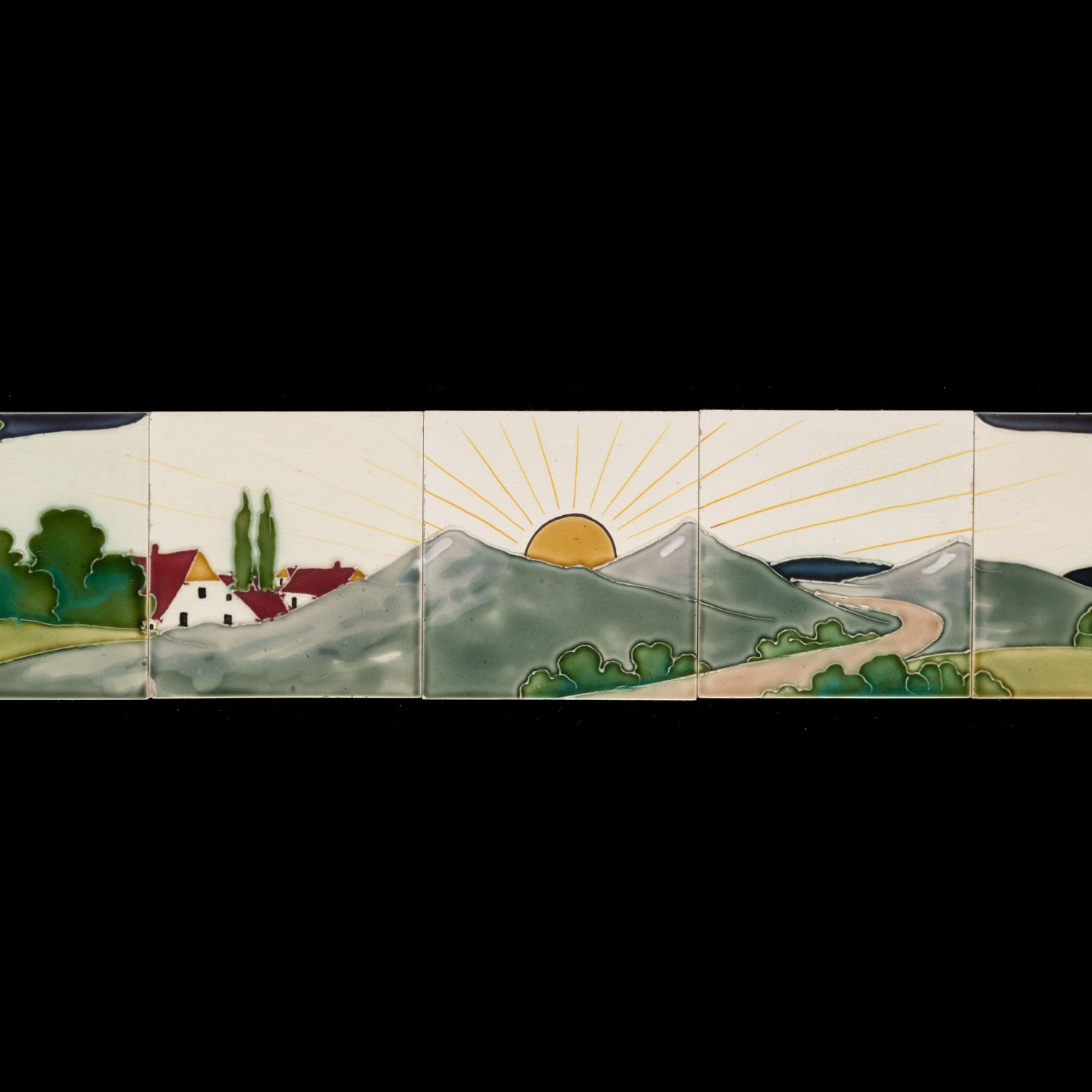 A Stunning Set of Antique German Art Nouveau Ostara Tiles This magnificent set of antique Art Nouveau tiles, manufactured by Ostara in Germany, forms a captivating multi-tile landscape panel. The design features a serene sunrise over rolling hills and a village, executed in the distinctive **tubeline** technique.The scene unfolds across the tiles, depicting a charming village with red-roofed houses nestled among trees on the left, giving way to an expansive mountain landscape in the center. A striking sun, radiating bright yellow rays, is dramatically rising between the peaks. A winding path leads the eye through the pastoral setting. The entire composition is beautifully framed on the left and right by stylized organic motifs of leaves and branches, typical of the Art Nouveau (Jugendstil) aesthetic. The tiles boast a lovely condition with vibrant, clear glazesthat highlight the rich greens, blues, oranges, and creamy white background. The tubeline outlining provides excellent definition and texture to the image. There are only a few minor chips/damages to the edges, which are consistent with the age of these antique pieces and do not detract from the overall striking display.This is a wonderful example of German Art Nouveau ceramic art, perfect for a collector or for adding a period focal point to an interior.