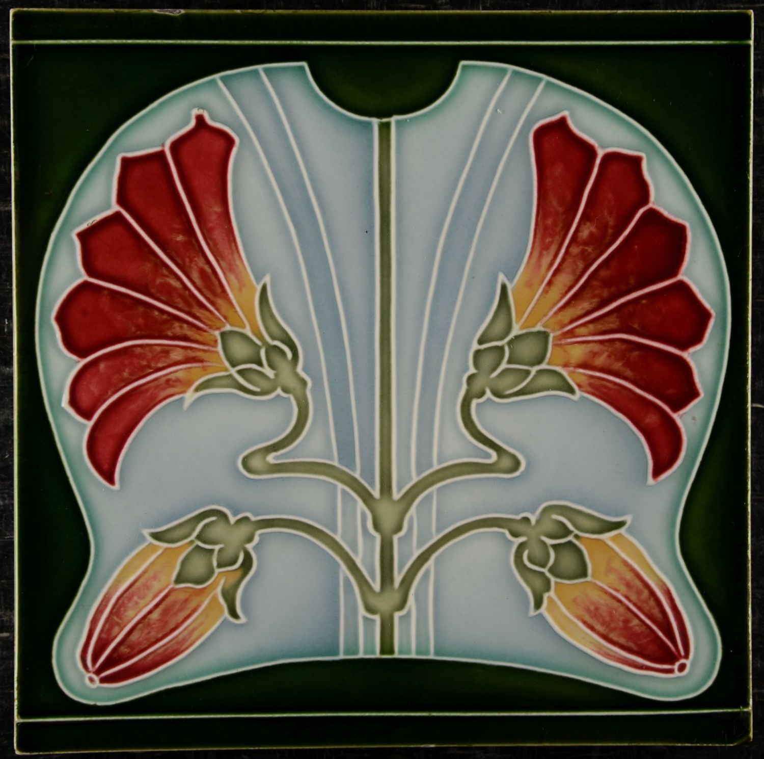 This Art Nouveau tile by Tonwerk Offstein showcases the company’s refined mastery of dust-pressed relief and luminous glazing.The design features a symmetrically arranged botanical motif: two large, fan-shaped blossoms unfurl in vibrant shades of red and yellow, while a pair of downward-facing buds mirrors the composition below. All four flowers emerge from elegantly flowing stems that create a rhythmic, organic structure. The background transitions through soft tones of grey and deep green, providing a rich contrast that highlights the crisp relief lines and the delicate shaping of each petal. The tile is in very fine condition with strong colours and intact relief. Only a few light surface scratches are present, which remain minor and unobtrusive.