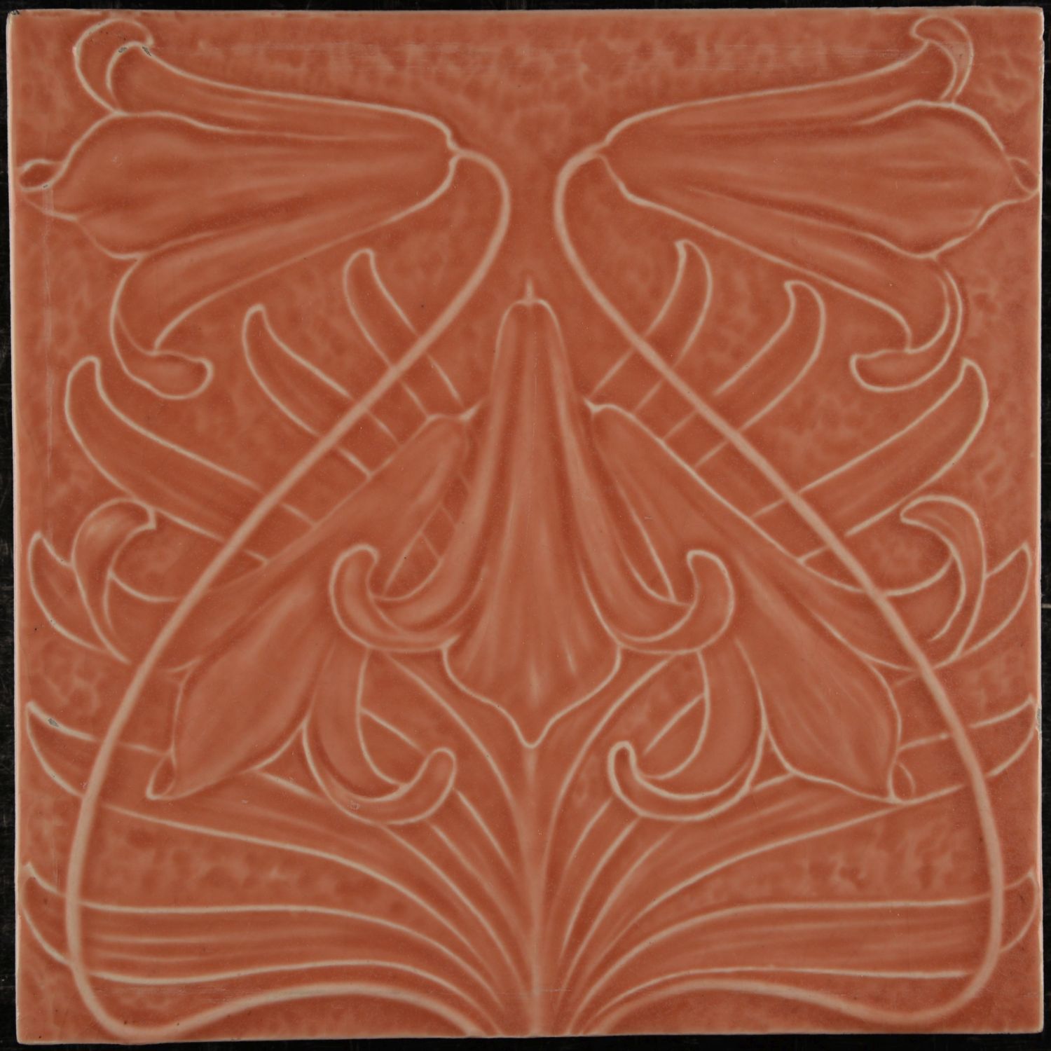 This Art Nouveau ceramic tile by Utzschneider & Co., Sarreguemines, France features a stylised floral motif rendered in soft relief. The design is dominated by flowing, symmetrical lily forms, their elegant curves outlined in lighter slip against a warm terracotta-red ground with subtle mottling. The raised decoration and gentle colour gradation give the tile a sculptural quality, typical of Sarreguemines production around the turn of the 20th century. Both decorative and architectural in character, the tile reflects the organic lines and refined craftsmanship that define French Art Nouveau ceramics.