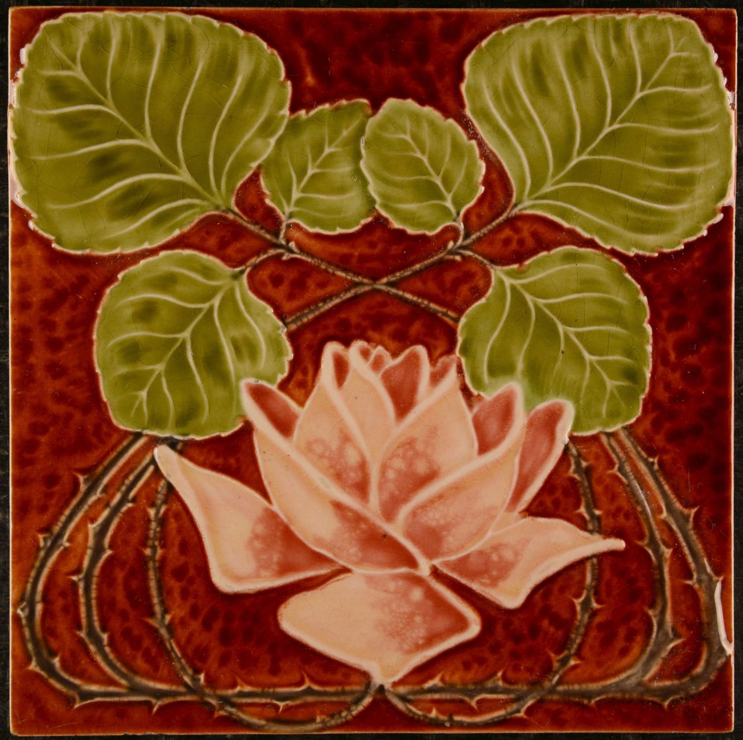A beautiful Art Nouveau tile produced by the renowned Utzschneider & Cie, Sarreguemines (France), dating to the early 20th century (circa 1900–1910). The design features a stylised flowering plant with a soft pink blossom set against a rich, deep red ground. Elegant green leaves and flowing stems create a harmonious, symmetrical composition typical of the Art Nouveau movement. The glaze remains bright and vibrant, with subtle craquelure adding character without detracting from the overall appearance, excellent condition!
