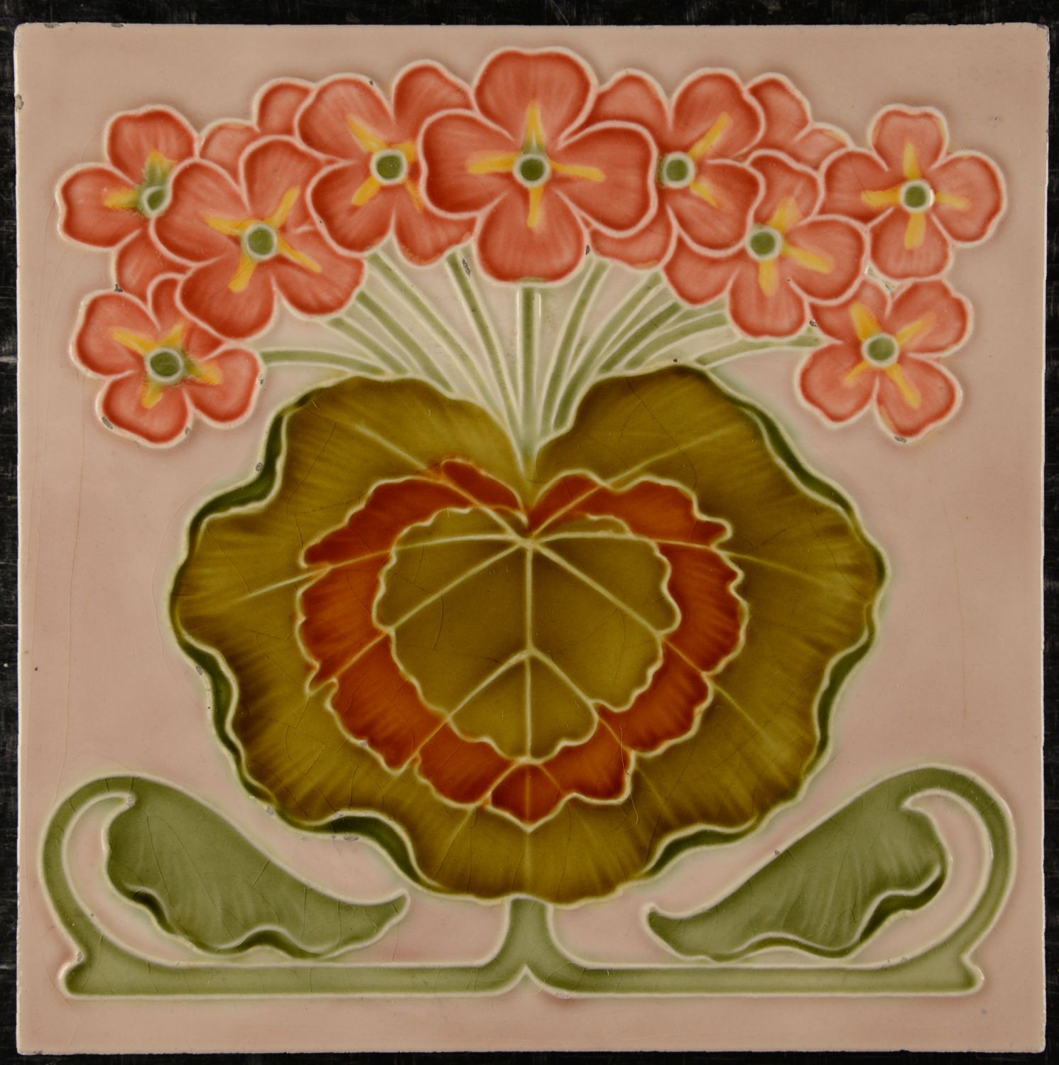 Utzschneider & Cie Sarreguemines Art Nouveau Tile, c.1900 An original Art Nouveau tile made around 1900 by Utzschneider & Cie, Sarreguemines, France. Featuring a vibrant relief design of stylized pink blossoms and green foliage on a soft pastel background, created using the traditional dust-press technique. The glossy glaze beautifully enhances the tile’s delicate colors and raised floral detailing. The reverse side is unmarked but has the typical line structure characteristic of this factory. The glaze and relief are in excellent condition, but there is some minor damage visible around the edges.