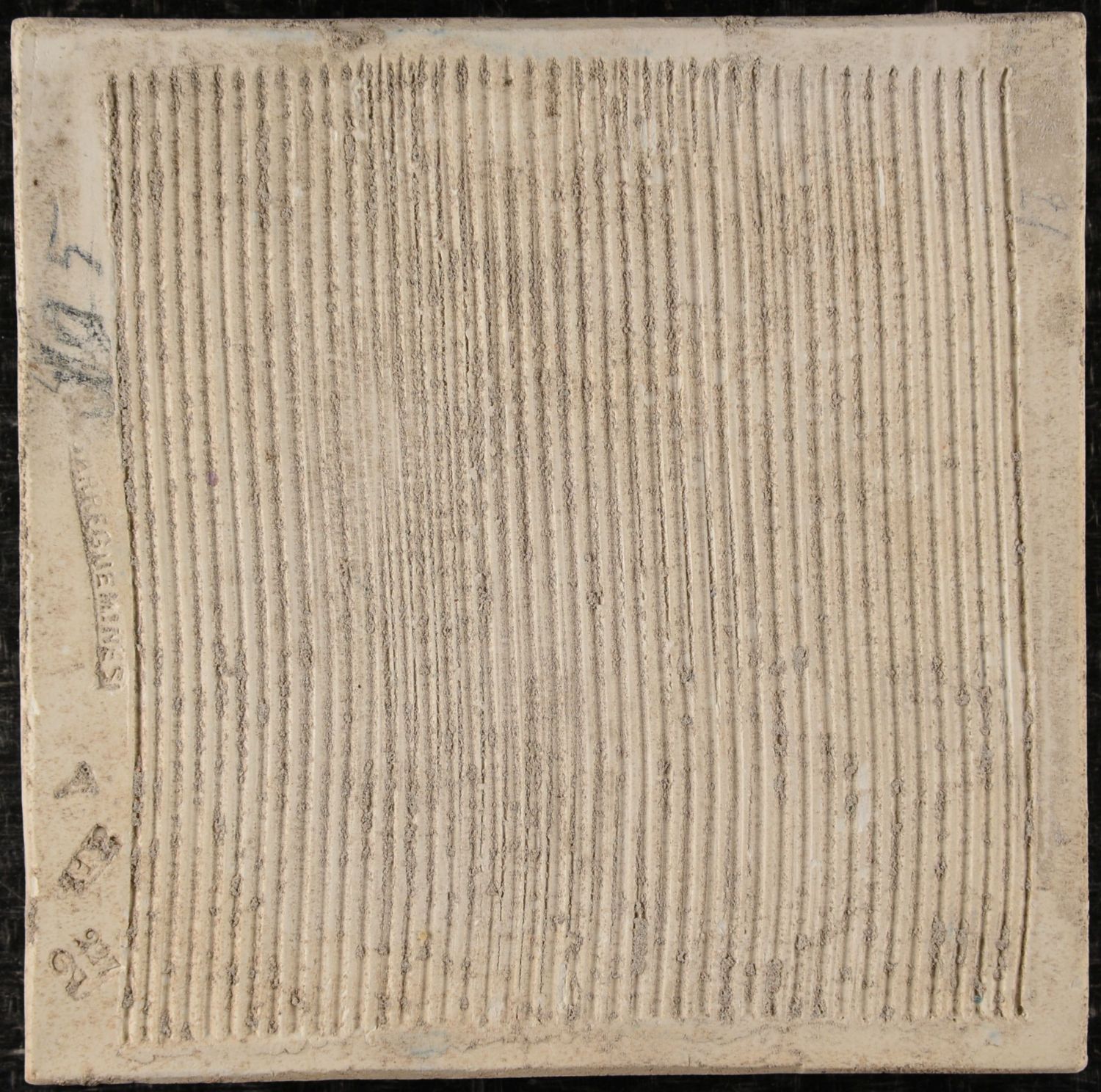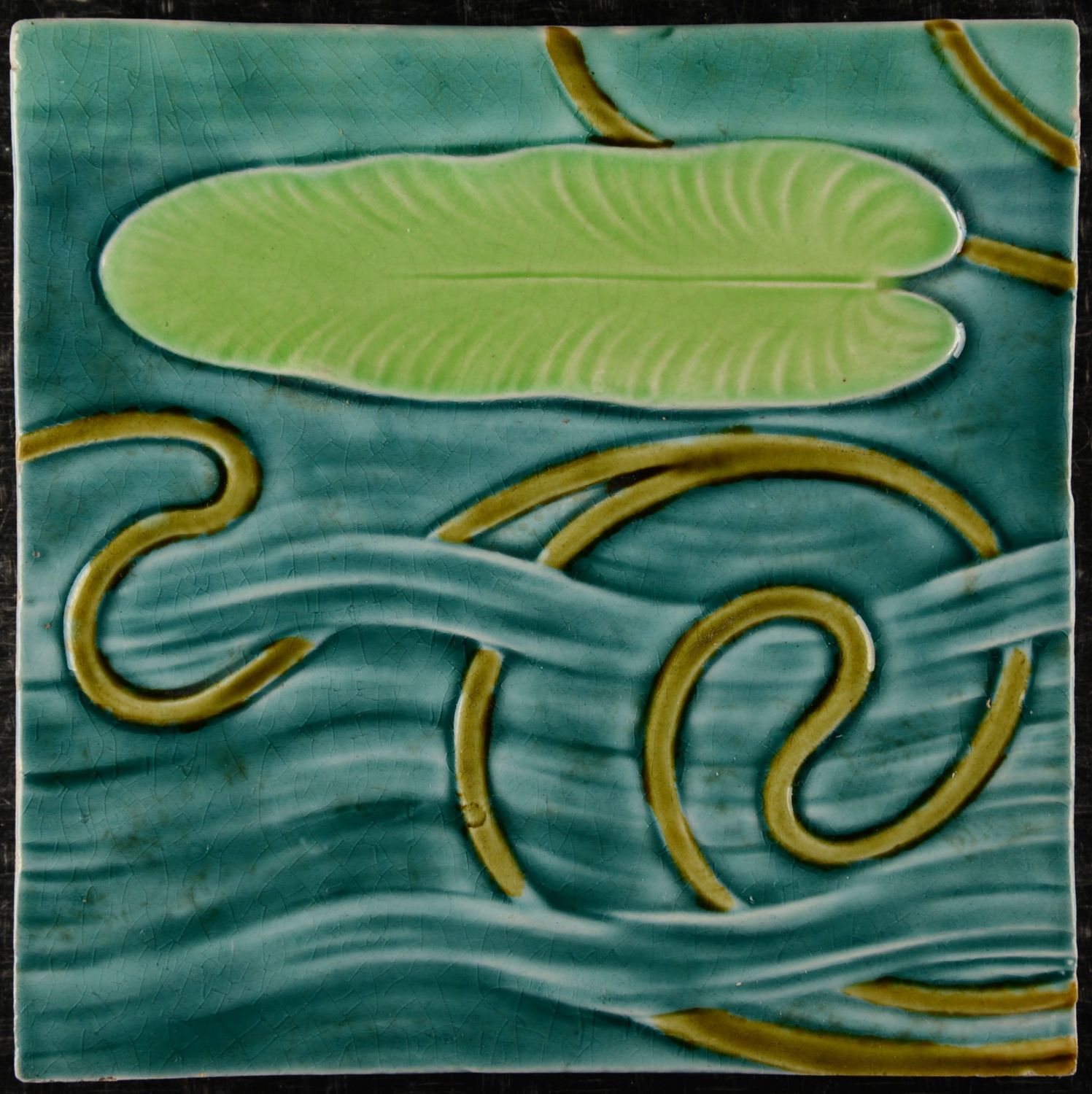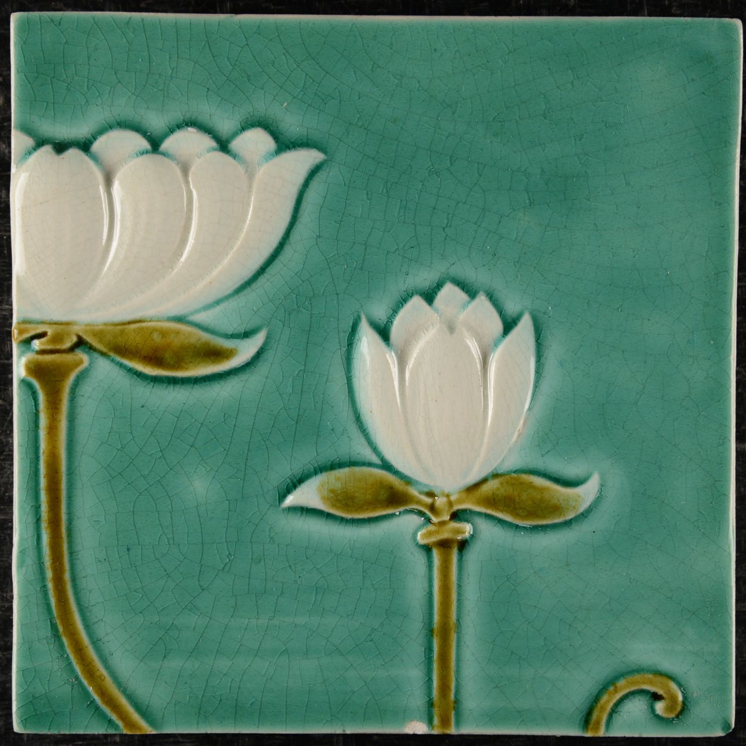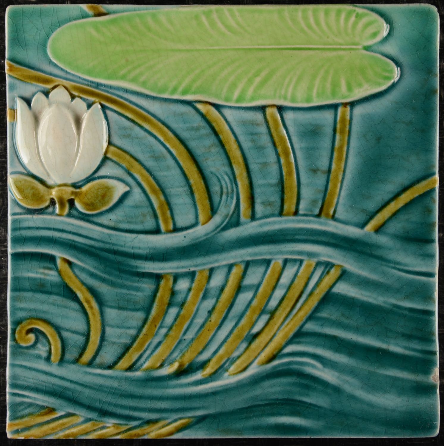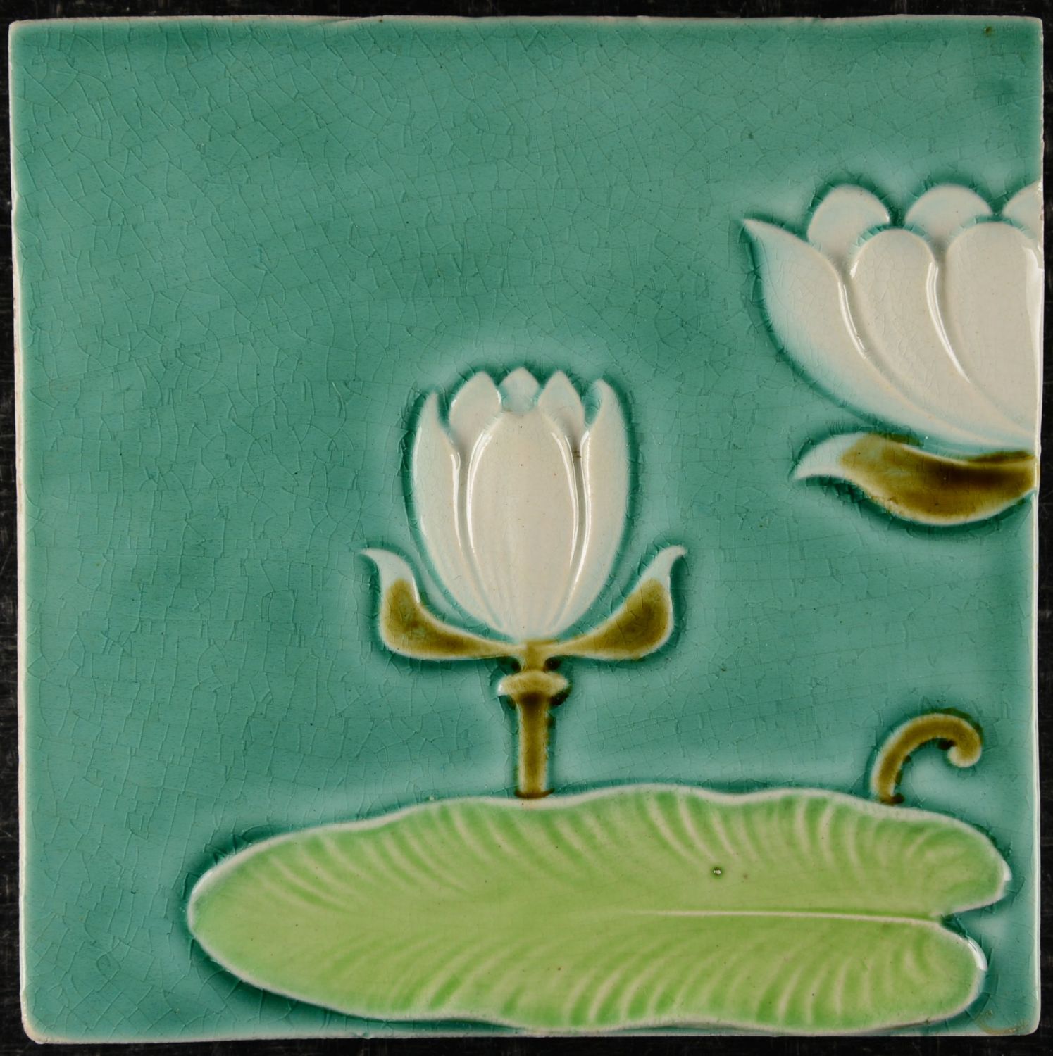 This beautiful set of four ceramic tiles, manufactured by Utzschneider & Cie, Sarreguemines, dates from around 1900. The tiles feature a delicate Art Nouveau design in relief, crafted from plastic clay, depicting elegant white water lilies with soft green leaves rising from stylized swirling stems and waves. The background displays a tranquil turquoise tone that enhances the natural motif. The set is in good condition, showing only minor glaze imperfections. This is a very rare and finely executed example of early 20th-century decorative tile art.