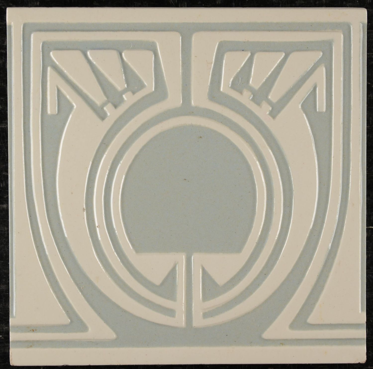 Original antique Art Nouveau tile made by Villeroy & Boch, Mettlach, Germany. Produced around 1900, it features a geometric relief design. The tile was designed by Peter Behrens (14 April 1868 – 27 February 1940), the renowned German architect and designer. The decoration was created in relief using the dust-press technique, where clay powder is compressed under high pressure in a mold. The tile is in very good condition.