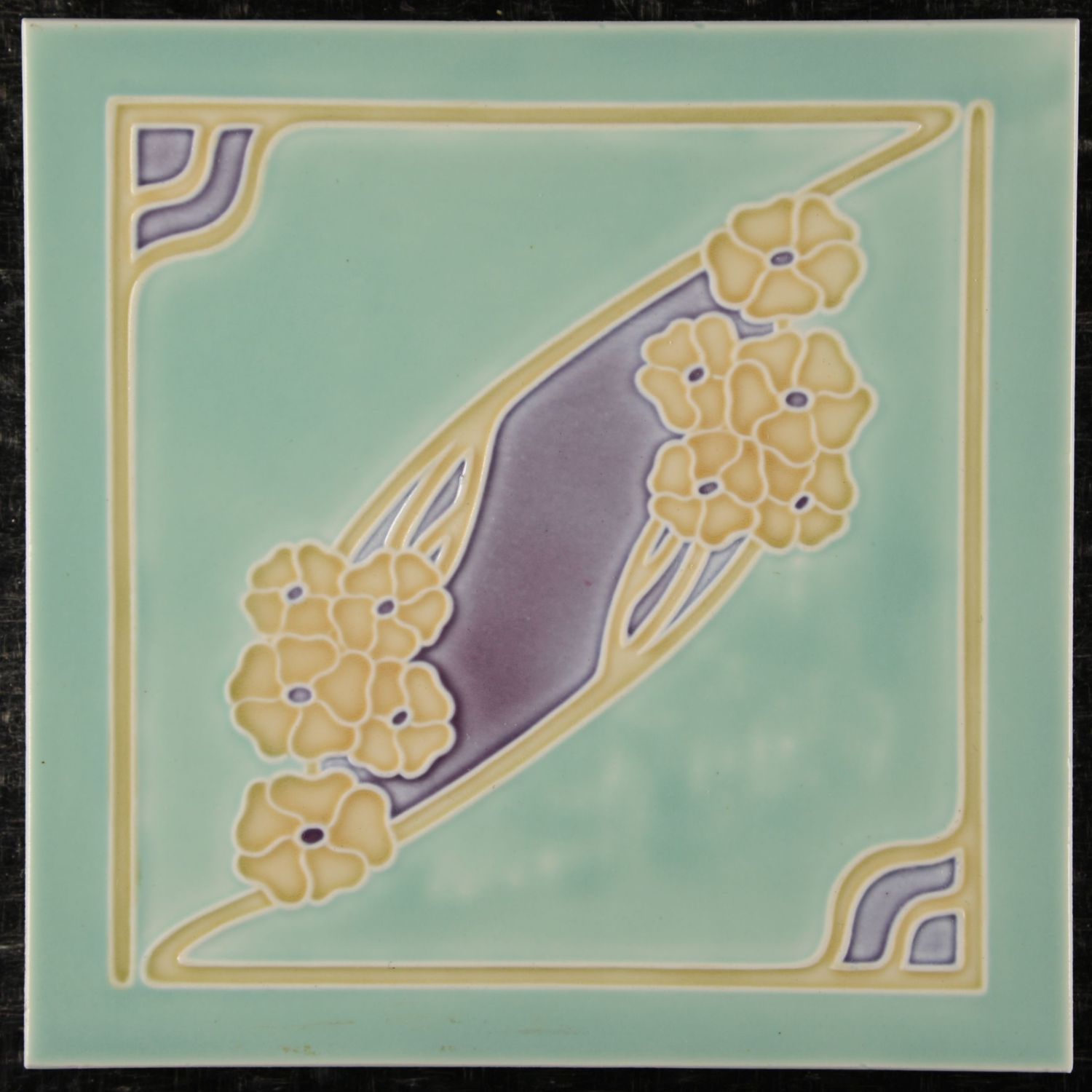 Art Nouveau tile, from the Villeroy & Boch factory in Dresden. This design is characteristically Art Nouveau (or Jugendstil), where nature serves as the source of inspiration, manifesting in organic, stylized forms. The motif is defined by a dynamic, diagonal composition, with clusters of gracefully shaped flowers flanking the elongated purple zone. The fluid, ochre-colored contour lines accentuate the relief and ensure a clear separation of the color fields, while simultaneously evoking the style's distinctive 'whiplash lines.' The square border is decoratively and stylishly interrupted in the corners, underscoring the refinement of this historical ornamental tile work. Excellent condition tile!!