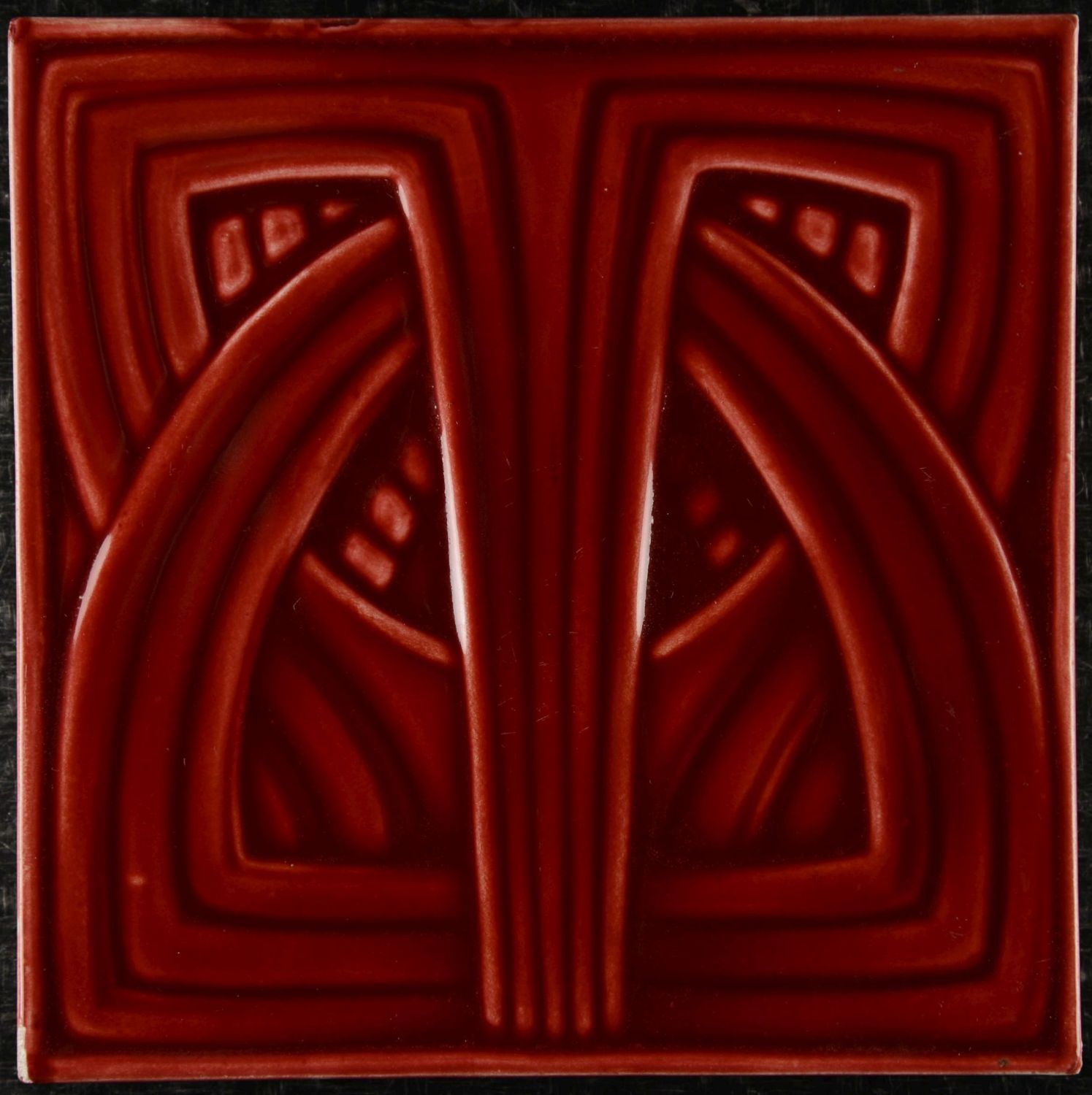 This exceptional Villeroy & Boch Mettlach tile, with a design attributed to Henry van de Velde. Produced using the dust-pressed technique, the tile features a sculpted relief that brings its dynamic, flowing forms into striking visual focus. Rendered in a rich, glossy oxblood red glaze, the surface enhances the depth of the relief and adds a luxurious, almost sculptural presence. Good condition tile, but with some glaze damage to bottom left corner.