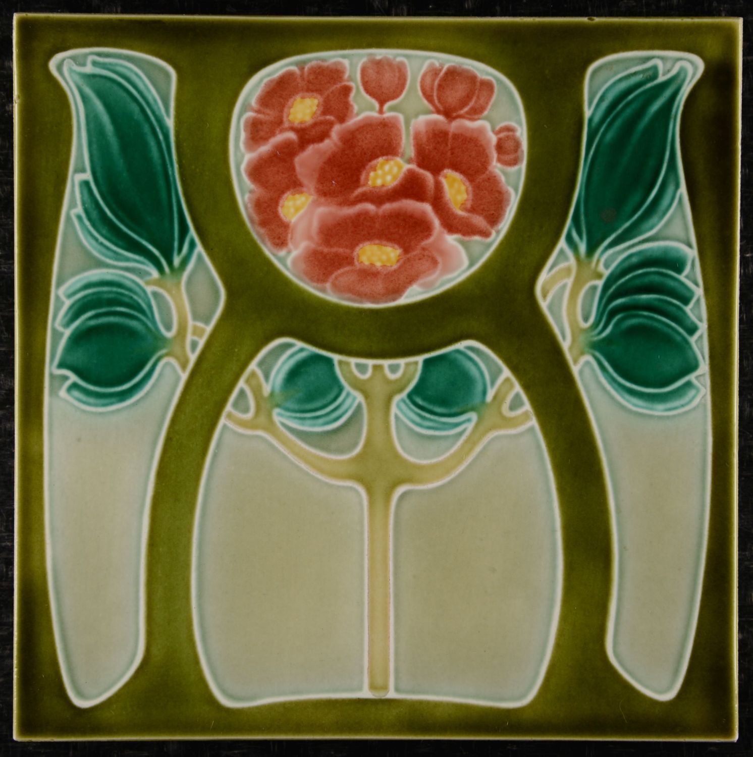 This exceptional Art Nouveau tile, produced by Villeroy & Boch Dresden, showcases a more organic, curving style of the Art Nouveau movement. The intricate, three-dimensional design is created using the Dust-press relief, which separates the different coloured glazes. The design is highly stylized, featuring a prominent cluster of open flowers in a circular frame, balanced by elegant, elongated leaves and abstract forms that evoke a graceful plant structure. Tile is in excellent condition.