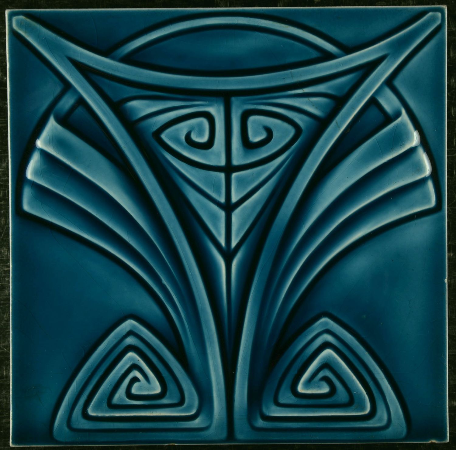 This is a Art Nouveau ceramic tile, from Wessel’s Wandplattenfabrik in Bonn, Germany, dating to the height of the Jugendstil period around the turn of the 20th century. The tile is rendered in a stunning deep teal or rich cobalt blue glaze that showcases a luxurious, almost liquid sheen, appearing to be in beautiful, antique condition. The surface features a dense, symmetrical design executed in relief, a technique that allows the brilliant glaze to pool in the recesses while clinging smoothly to the sharply defined ridges. The central motif is a highly stylized, abstract depiction of an ascending floral or foliate form, characterized by powerful, sweeping lines that suggest growth and vitality.