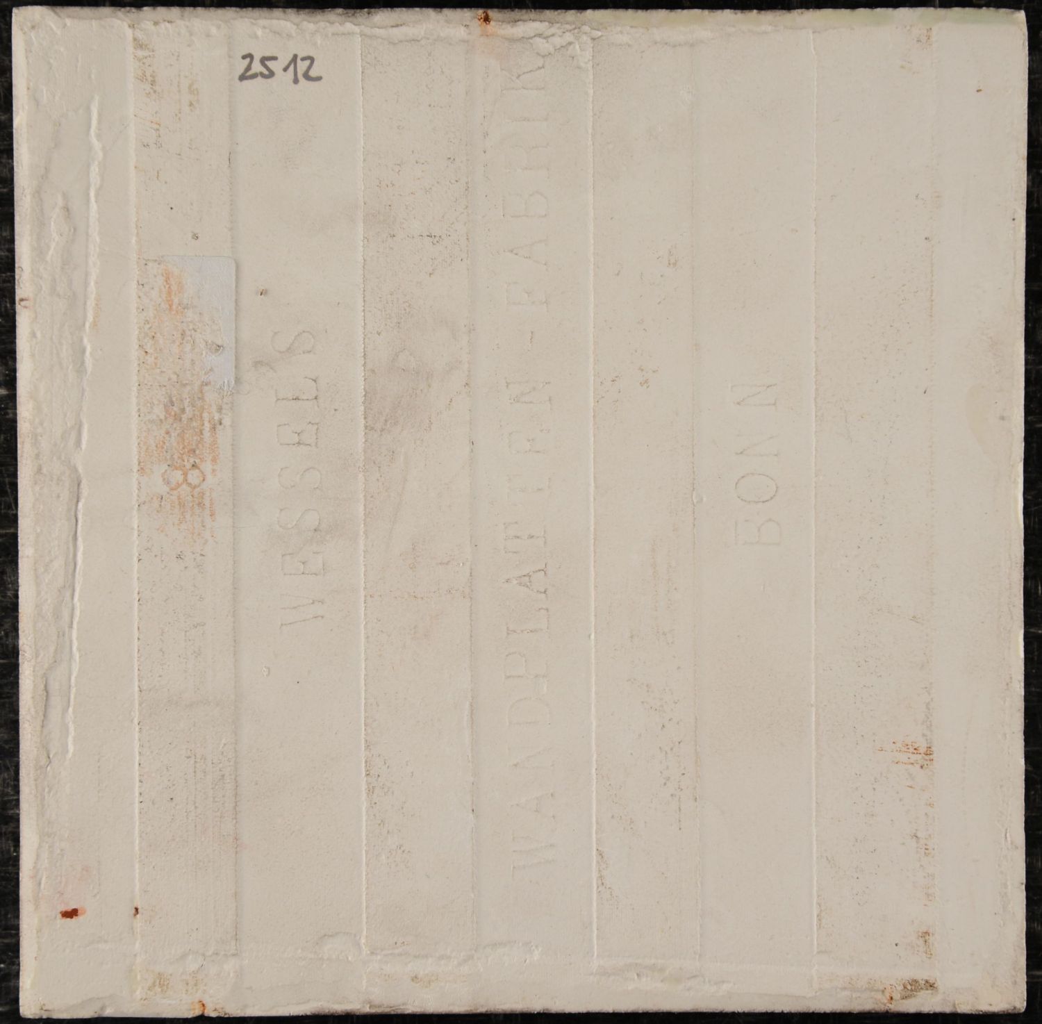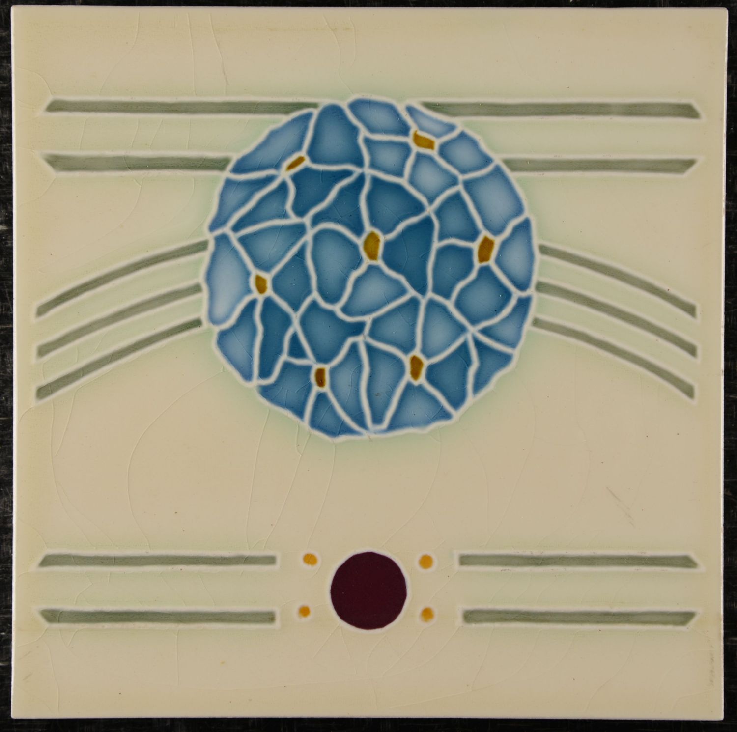 This tile is a fine example of Art Nouveau aesthetics and was manufactured by Wessel Bonn (Wessel's Wandplattenfabrik, Bonn am Rhein, Germany). The tile is in excellent condition and is decorated with relief motifs applied using the Dust-press method, a technique widely used for industrial tiles at the time. The design is centred around a striking light blue sphere with floral motifs. This central motif is symmetrically framed by parallel, flowing lines.