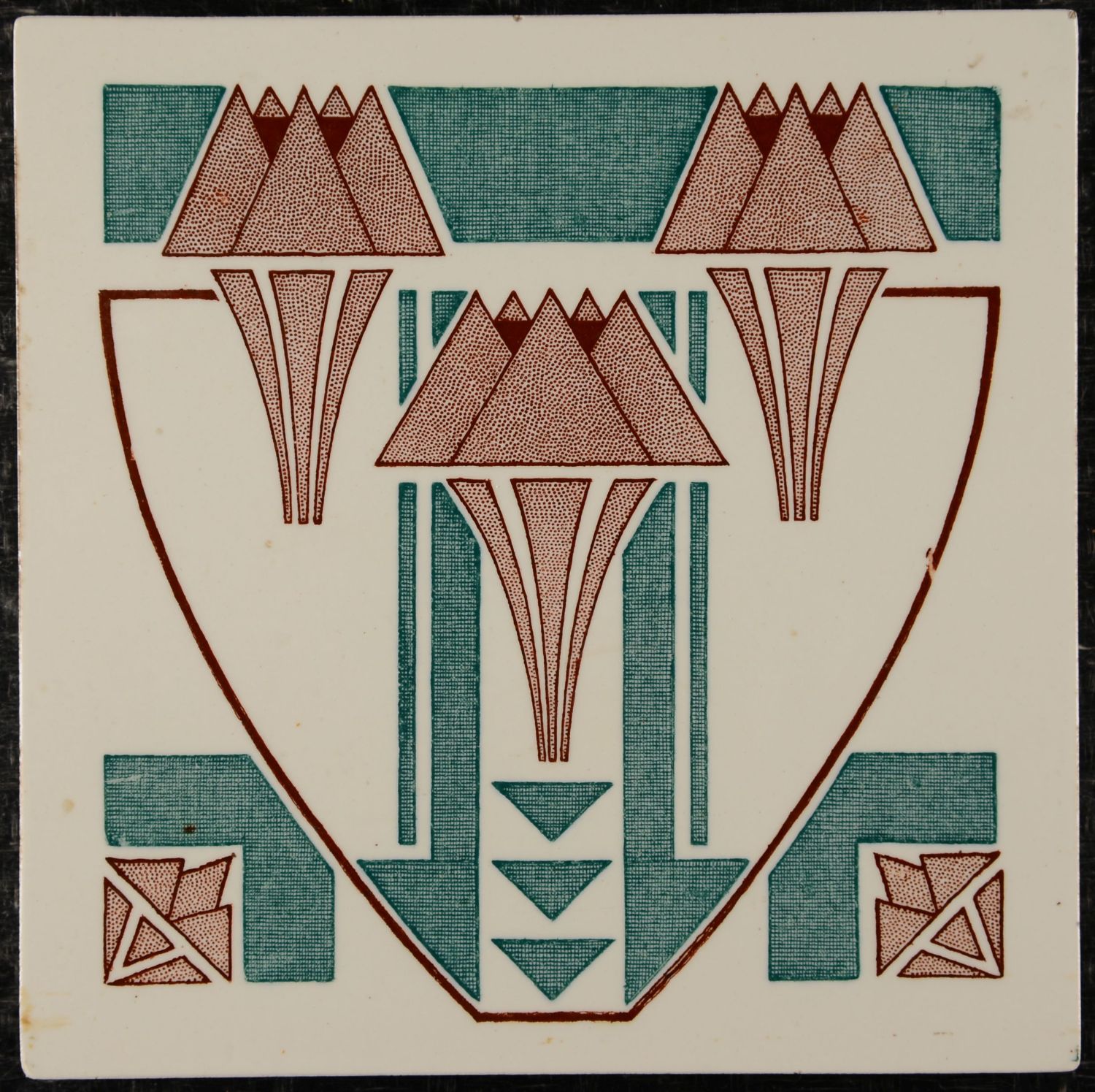 This Wessel, Bonn tile showcases a bold, highly geometric and stylized floral design. The decoration is executed using a stencilled or transfer-printed technique on a flat white, rather than being embossed in relief. The design uses a limited, striking colour palette of reddish-brown (terracotta) and a deep teal or petrol green, all outlined or bordered by thin brown lines. The central motif consists of three tiered, triangular forms, resembling highly abstract flower buds or seed pods, which sit atop long, flaring stems. The primary forms are filled with a stippled or finely dotted pattern in the reddish-brown, while supporting elements, like the vertical bars and horizontal bands, are filled with a cross-hatched pattern in the teal-green. The overall composition is strictly symmetrical and contained within a large, reddish-brown, shield-like or heart-shaped outline.